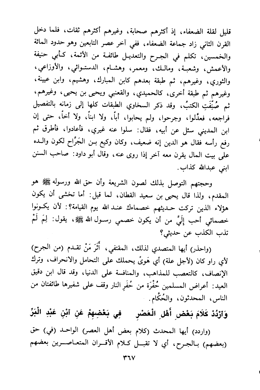 قليل لقلة الضعفاء، إذ أكثرهم صحابة، وغيرهم أكثرهم ثقات، فلما دخل القرن الثاني زاد جماعة الضعفاء، ففي آخر عصر التابعين وهو حدود المائة والخمسين، تكلم في الجرح والتعديل طائفة من الأئمة، كأبي حنيفة والأعمش، وشعبة، ومالك، ومعمر، وهشام، الدستوائي، والأوزاعي، والثَّوري، وغيرهم، ثم طبقة بعدهم كابن المبارك، وهشيم، وابن عيينة، وغيرهم ثم طبقة أخرى، كالحميدي، والقعنبي وَيَحْيَى بن يَحْيَى، وغيرهم، ثم صُنِّفَتِ الكتبُ، وقد ذكر السخاوي الطبقات كلها إلى زمانه بالتفصيل فراجعه، فعدَّلوا، وجرحوا، ولم يحابوا، أباً، ولا ابناً، ولا أخاً، حتى إن ابن المديني سئل عن أبيه، فقال: سلوا عنه غيري، فأعادوا، فأطرق ثم رفع رأسه فقال هو الدِّين إنه ضعيف، وكان وكيع بن الجَرَّاح لكون والده على بيت المال يقرن معه آخر إذا روى عنه، وقال أبو داود: صاحب السنن ابني عبد الله كذَّاب.
