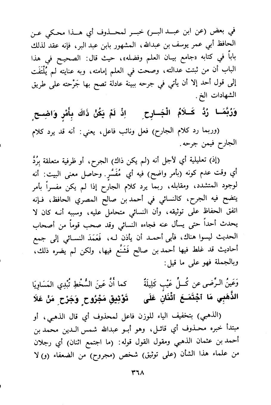 (إذ) تعليلية أي لأجل أنه (لم يكن ذاك) الجرح، أو ظرفية متعلقة بِردَّ أي وقت عدم كونه (بأمر واضح) فيه أي مُفَسَّرٍ. وحاصل معنى البيت: أنه لوجود المتشدد، ومقابله، ربما يرد كلام الجارح إذا لم يكن مفسراً بأمر يتضح فيه الجرح، كالنسائي في أحمد بن صالح المصري الحافظ، فإنه اتفق الحفاظ على توثيقه، وأن النسائي متحامل عليه، وسببه أنه كان لا يحدث أحداً حتى يسأل عنه فجاءه النسائي وقد صحب قوماً من أصحاب الحديث ليسوا هناك، فأبى أحمد أن يأذن له، فَعَمَدَ النسائي إلى جمع أحاديث قد غلط فيها أحمد بن صالح فَشَنَّع فيها، ولكن لم يضره ذلك، وبالجملة فهو على ما قيل: