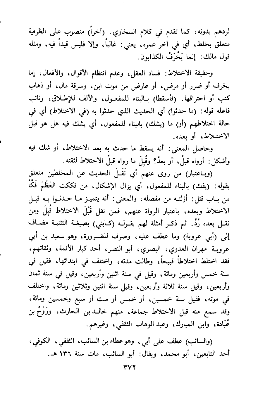 (وباعتبار) من روى عنهم أي نَقَلَ الحديث عن المخلطين متعلق بقوله: (يفك) بالبناء للمفعول، أي يزال الإشكال، من فككت العَظْمَ فَكًّا من باب قتل: أزلته من مفصله، والمعنى: أنه يتميز ما حدثوا به قبل الاختلاط وبعده، باعتبار الرواة عنهم، فمن نقل قَبْلَ الاختلاط قبِلَ ومن نقل بعده رُدَّ. ثم ذكر أمثلة لهم بقوله (كابني) بصيغة التثنية مضاف إلى (أبي عروبة) وما عطف عليه، وصرف للضرورة، وهو سعيد بن أبي عروبة مهران العدوي، البصري، أبو النضر، أحد كبار الأئمة، وثقاتهم، فقد اختلط اختلاطاً قبيحاً، وطالت مدته، واختلف في ابتدائها، فقيل في سنة خمس وأربعين ومائة، وقيل في سنة اثنين وأربعين، وقيل في سنة ثمان وأربعين، وقيل سنة ثلاثة وأربعين، وقيل سنة اثنين وثلاثين ومائة، واختلف في موته، فقيل سنة خمسين، أو خمس أو ست أو سبع وخمسين ومائة، وقد سمع منه قبل الاختلاط جماعة، منهم خالد بن الحارث، ورَوْحُ بن عُبَادة، وابن المبارك، وعبد الوهاب الثقفي، وغيرهم.