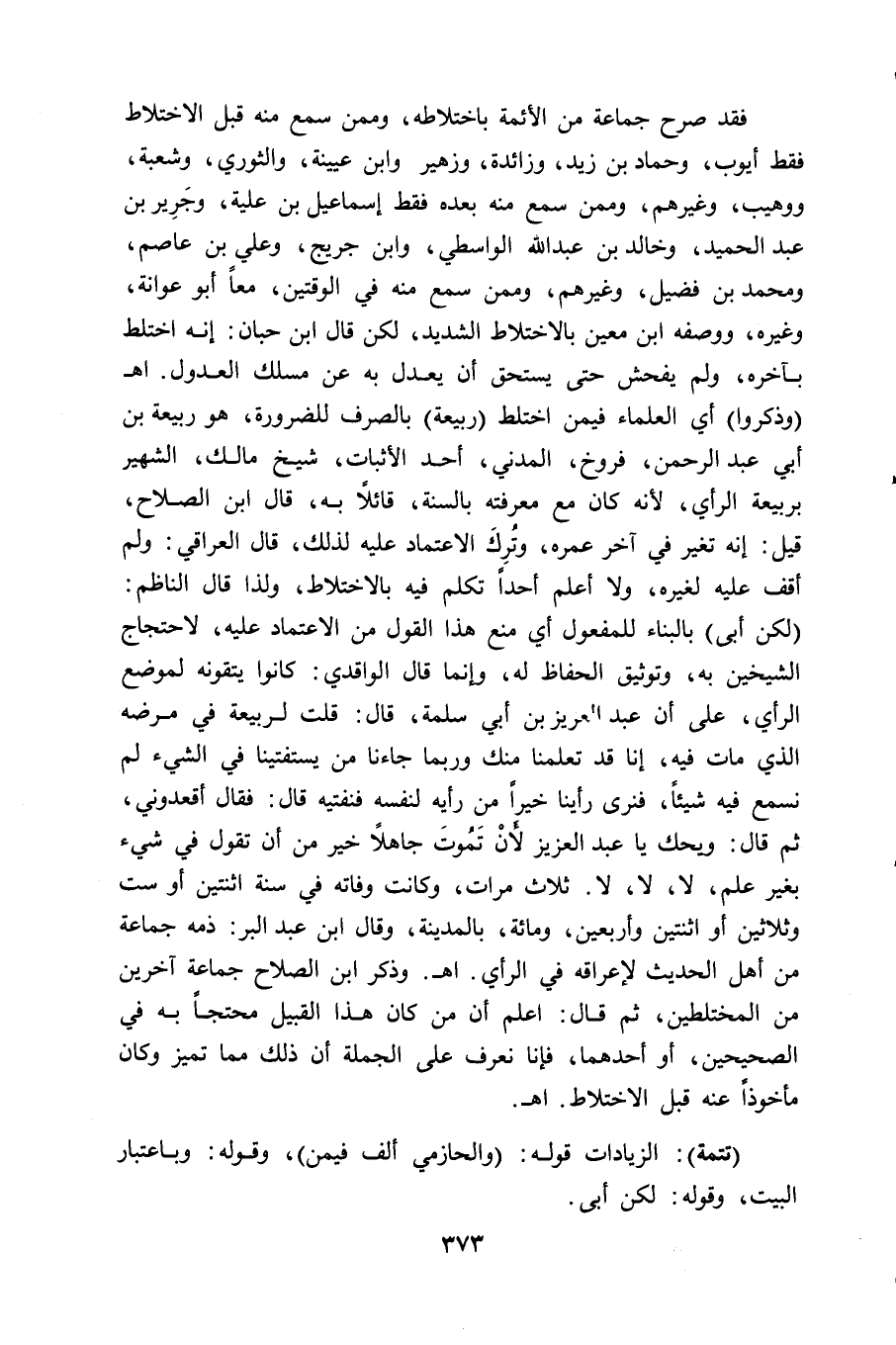 (وذكروا) أي العلماء فيمن اختلط (ربيعة) بالصرف للضرورة، هو ربيعة بن أبي عبد الرحمن، فروخ، المدني، أحد الأثبات، شيخ مالك، الشهير بربيعة الرأي، لأنه كان مع معرفته بالسنة، قائلًا به، قال ابن الصلاح، قيل: إنه تغير في آخر عمره، وتُرِكَ الاعتماد عليه لذلك، قال العراقي: ولم أقف عليه لغيره، ولا أعلم أحداً تكلم فيه بالاختلاط، ولذا قال الناظم: (لكن أبى) بالبناء للمفعول أي منع هذا القول من الاعتماد عليه، لاحتجاج الشيخين به، وتوثيق الحفاظ له، وإنما قال الواقدي: كانوا يتقونه لموضع الرأي، على أن عبد العزيز بن أبي سلمة، قال: قلت لربيعة في مرضه الذي مات فيه، إنا قد تعلمنا منك وربما جاءنا من يستفتينا في الشيء لم نسمع فيه شيئاً، فنرى رأينا خيراً من رأيه لنفسه فنفتيه قال: فقال أقعدوني، ثم قال: ويحك يا عبد العزيز لأنْ تَمُوتَ جاهلاً خير من أن تقول في شيء بغير علم، لا، لا، لا. ثلاث مرات، وكانت وفاته في سنة اثنتين أو ست وثلاثين أو اثنتين وأربعين، ومائة، بالمدينة، وقال ابن عبد البر: ذمَّه جماعة من أهل الحديث لإعراقه في الرأي. اهـ. وذكر ابن الصلاح جماعة آخرين من المختلطين، ثم قال: اعلم أن من كان هذا القبيل محتجاً به في الصَّحِيحين، أو أحدهما، فإنا نعرف على الجملة أن ذلك مما تميز وكان مأخوذاً عنه قبل الاختلاط. اهـ.