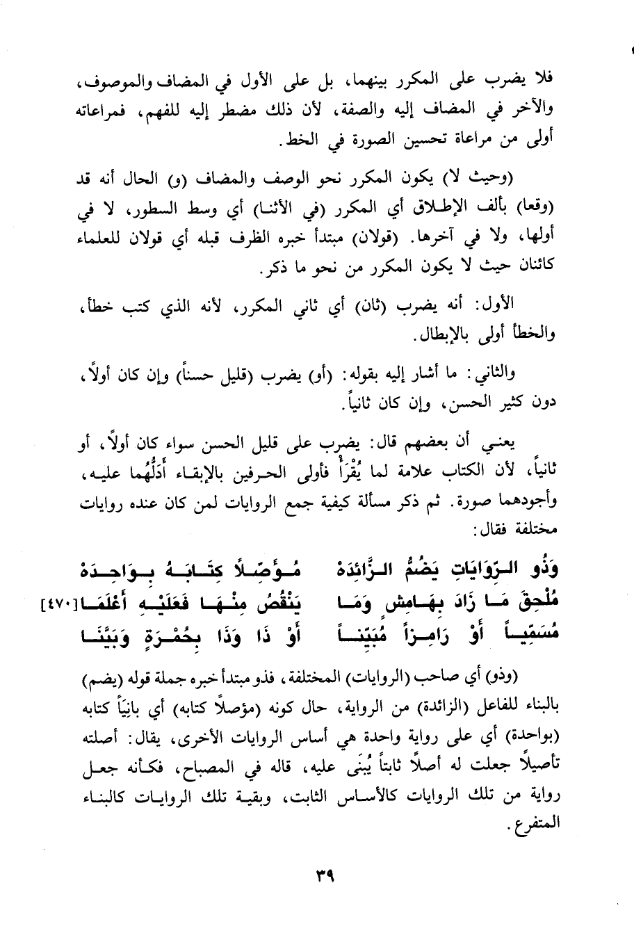 فلا يضرب على المكرر بينهما، بل على الأول في المضاف والموصوف، والآخر في المضاف إليه والصفة، لأن ذلك مضطر إليه للفهم، فمراعاته أولى من مراعاة تحسين الصورة في الخط.