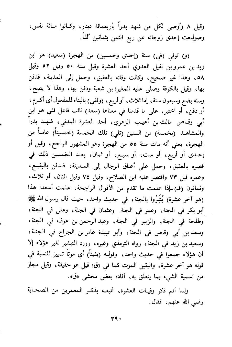 (و) توفي (في) سنة (إحدى وخمسين) من الهجرة (سعيد) هو ابن زيد بن عمرو بن نفيل العدوي أحد العشرة وقيل سنة 50 وقيل 52 وقيل 58، وهذا غير صحيح، وكانت وفاته بالعقيق، وحمل إلى المدينة، فدفن بها، وقيل بالكوفة وصلى عليه المغيرة بن شعبة ودفن بها، وهذا لا يصح، وسنه بضع وسبعون سنة، إما ثلاث، أوأربع، (وقفي) بالبناء للمفعول أي أكرم، أو دفن، أو اختير، على ما قدمنا في معناها (سعد) نائب فاعل قفي هو ابن أبي وقاص مالك بن أهيب الزهري، أحد العشرة المدني، شهد بدراً والمشاهد (بخمسة) من السنين (تلي) تلك الخمسة (خمسيناً) عاماً من الهجرة، يعني أنه مات سنة 55 من الهجرة وهو المشهور الراجح، وقيل أو إحدى أو أربع، أو ست، أو سبع، أو ثمان، بعد الخمسين ذلك في قصره بالعقيق، وحمل على أعناق الرجال إلى المدينة، فدفن بالبقيع، وعمره قيل 73 واقتصر عليه ابن الصلاح، وقيل 74 وقيل اثنان، أو ثلاث، وثمانون (فـ) ـإذا علمت ما تقدم من الأقوال الراجحة، علمت أسعدا هذا (هو آخر عشرة) بُشِّرُوا بالجنة، في حديث واحد، حيث قال رسول الله - صلى الله عليه وسلم - أبو بكر في الجنة، وعمر في الجنة. وعثمان في الجنة، وعليٌّ في الجنة، وطلحة في الجنة، والزبير في الجنة، وعبد الرحمن بن عوف في الجنة، وسعد بن أبي وقاص في الجنة، وأبو عبيدة عامر بن الجراح في الجنة، وسعيد بن زيد في الجنة، رواه الترمذي وغيره، وورد التبشير لغير هؤلاء إلا أن هؤلاء جمعوا في حديث واحد، وقوله (يقيناً) أي موتاً تمييز للنسبة في قوله هو آخر عشرة، واليقين الموت كما في " ق " قيل هو حقيقة، وقيل مجاز من تسمية الشيء بما يتعلق به، أفاده بعض محشى " ق ".