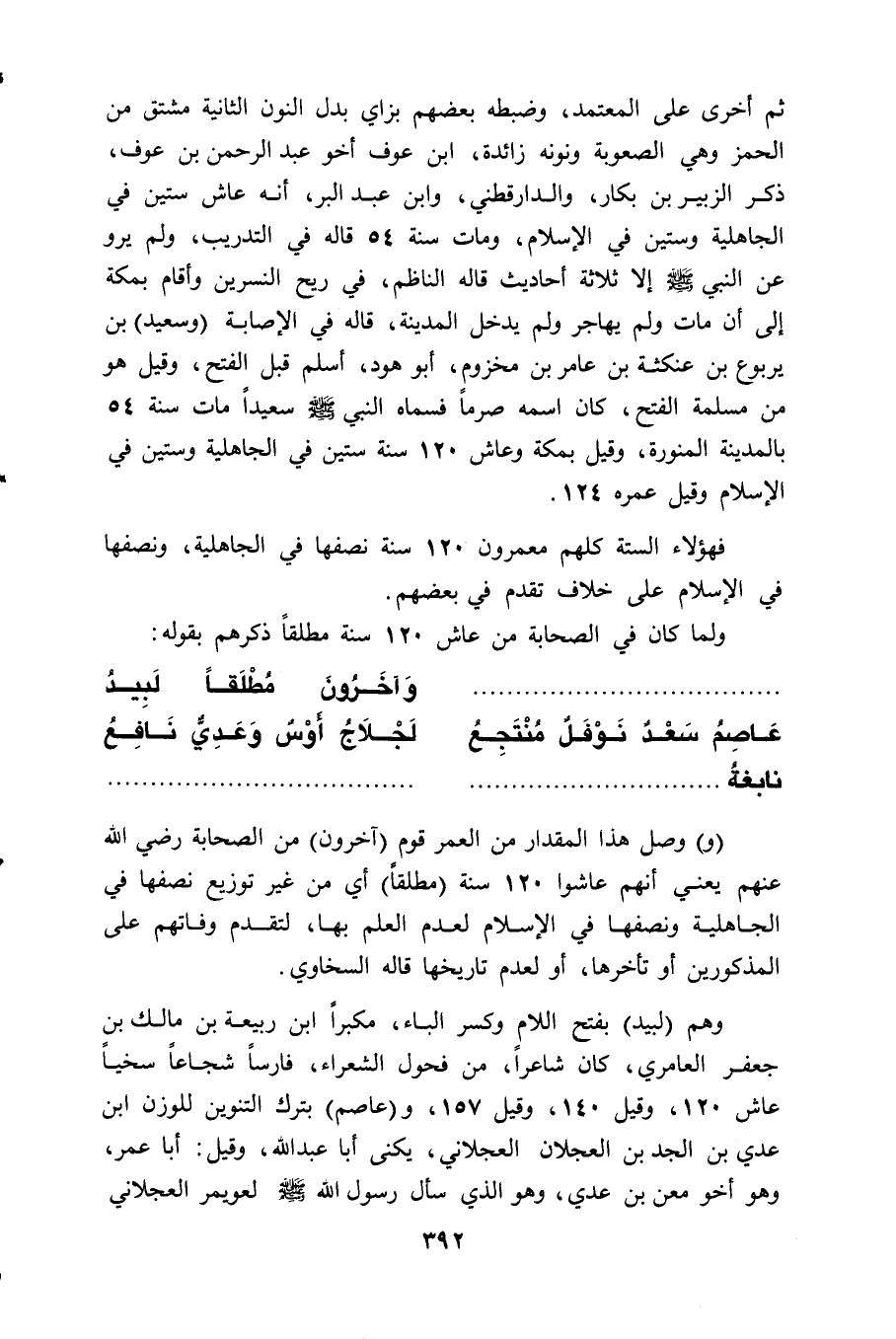 (و) وصل هذا المقدار من العمر قوم (آخرون) من الصحابة - رضي الله عنهم - يعني أنهم عاشوا 120 سنة (مطلقاً) أي من غير توزيع نصفها في الجاهلية ونصفها في الإسلام لعدم العلم بها، لتقدم وفاتهم على المذكورين أو تأخرها، أو لعدم تاريخها قاله السخاوي.