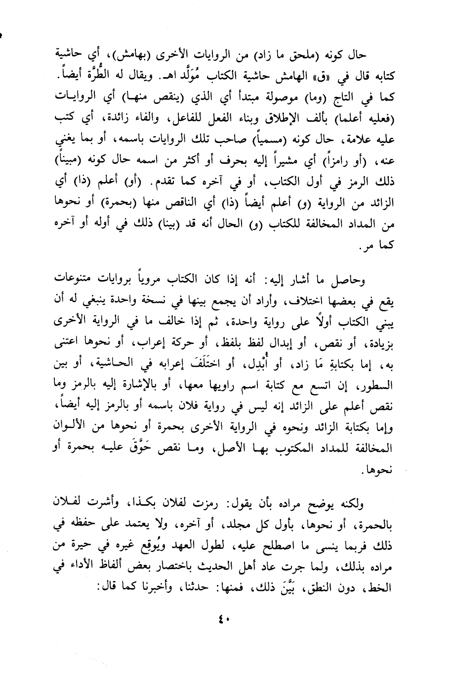 وحاصل ما أشار إليه: أنه إذا كان الكتاب مروياً بروايات متنوعات يقع في بعضها اختلاف، وأراد أن يجمع بينها في نسخة واحدة ينبغي له أن يبني الكتاب أولًا على رواية واحدة، ثم إذا خالف ما في الرواية الأخرى بزيادة، أو نقص، أو إبدال لفظ بلفظ، أو حركة إعراب، أو نحوها اعتنى به، إما بكتابةِ مَا زاد، أو أبْدِل، أو اختَلَفَ إعرابه في الحاشية، أو بين السطور، إن اتسع مع كتابة اسم راويها معها، أو بالإشارة إليه بالرمز وما نقص أعلم على الزائد إنه ليس في رواية فلان باسمه أو بالرمز إليه أيضاً، وإما بكتابة الزائد ونحوه في الرواية الأخرى بحمرة أو نحوها من الألوان المخالفة للمداد المكتوب بها الأصل، وما نقص حَوَّقَ عليه بحمرة أو نحوها.