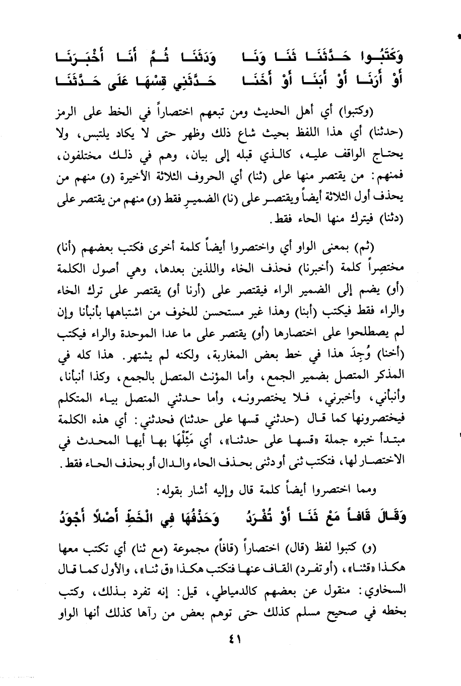(ثم) بمعنى الواو أي واختصروا أيضاً كلمة أخرى فكتب بعضهم (أنا) مختصِراً كلمة (أخبرنا) فحذف الخاء واللذين بعدها، وهي أصول الكلمة (أو) يضم إلى الضمير الراء فيقتصر على (أرنا أو) يقتصر على ترك الخاء والراء فقط فيكتب (أبنا) وهذا غير مستحسن للخوف من اشتباهها بأنبانا وإن لم يصطلحوا على اختصارها (أو) يقتصر على ما عدا الموحدة والراء فيكتب (أخنا) وُجِدَ هذا في خط بعض المغاربة، ولكنه لم يشتهر. هذا كله في المذكر المتصل بضمير الجمع، وأما المؤنث المتصل بالجمع، وكذا أنبأنا، وأنبأني، وأخبرني، فلا يختصرونه، وأما حدثني المتصل بياء المتكلم فيختصرونها كما قال (حدثني قسها على حدثنا) فحدثني: أي هذه الكلمة مبتدأ خبره جملة " قسها على حدثنا "، أي مَثِّلْهَا بها أيها المحدث في الاختصار لها، فتكتب ثني أودثني بحذف الحاء والدال أو بحذف الحاء فقط.