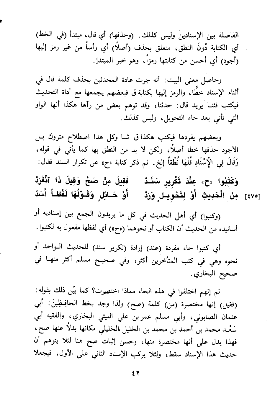 وبعضهم يفردها فيكتب هكذا " ق ثنا " وكل هذا اصطلاح متروك بل الأجود حذفها خطًّا أصلاً، ولكن لا بد من النطق بها كما يأتي في قوله، وَقَالَ فِي الْإِسْنَادِ قُلْهَا نُطْقاً إلخ. ثم ذكر كتابة " ح " عن تكرار السَّند فقال: