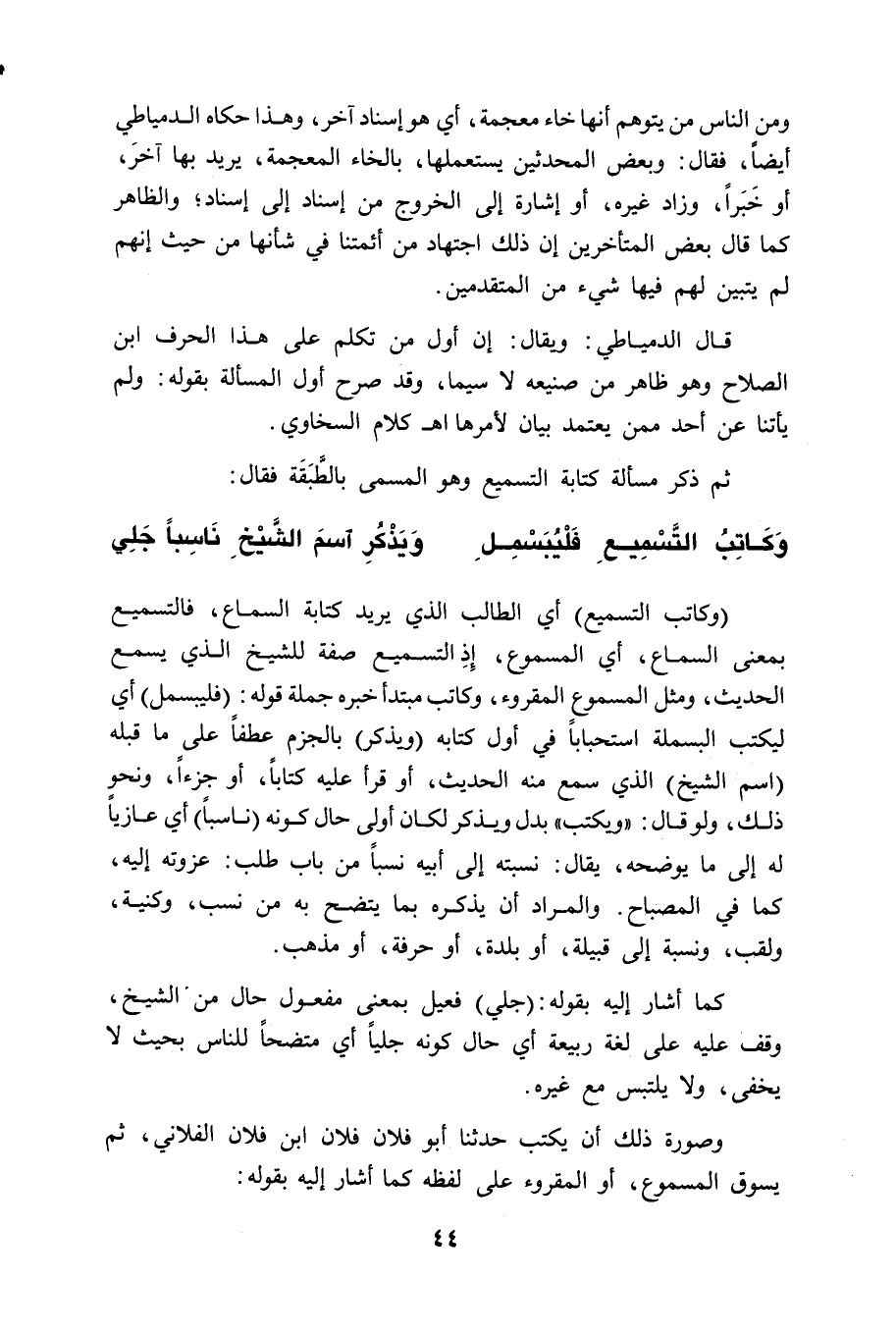 (وكاتب التسميع) أي الطالب الذي يريد كتابة السماع، فالتسميع بمعنى السماع، أي المسموع، إِذِ التسميع صفة للشيخ الذي يسمع الحديث، ومثل المسموع المقروء، وكاتب مبتدأ خبره جملة قوله: (فليبسمل) أي ليكتب البسملة استحباباً في أول كتابه (ويذكر) بالجزم عطفاً على ما قبله (اسم الشيخ) الذي سمع منه الحديث، أو قرأ عليه كتاباً، أو جزءاً، ونحو ذلك، ولو قال: " ويكتب " بدل ويذكر لكان أولى حال كونه (ناسباً) أي عازياً له إلى ما يوضحه، يقال: نسبته إلى أبيه نسباً من باب طلب: عزوته إليه، كما في المصباح. والمراد أن يذكره بما يتضح به من نسب، وكنية، ولقب، ونسبة إلى قبيلة، أو بلدة، أو حرفة، أو مذهب.