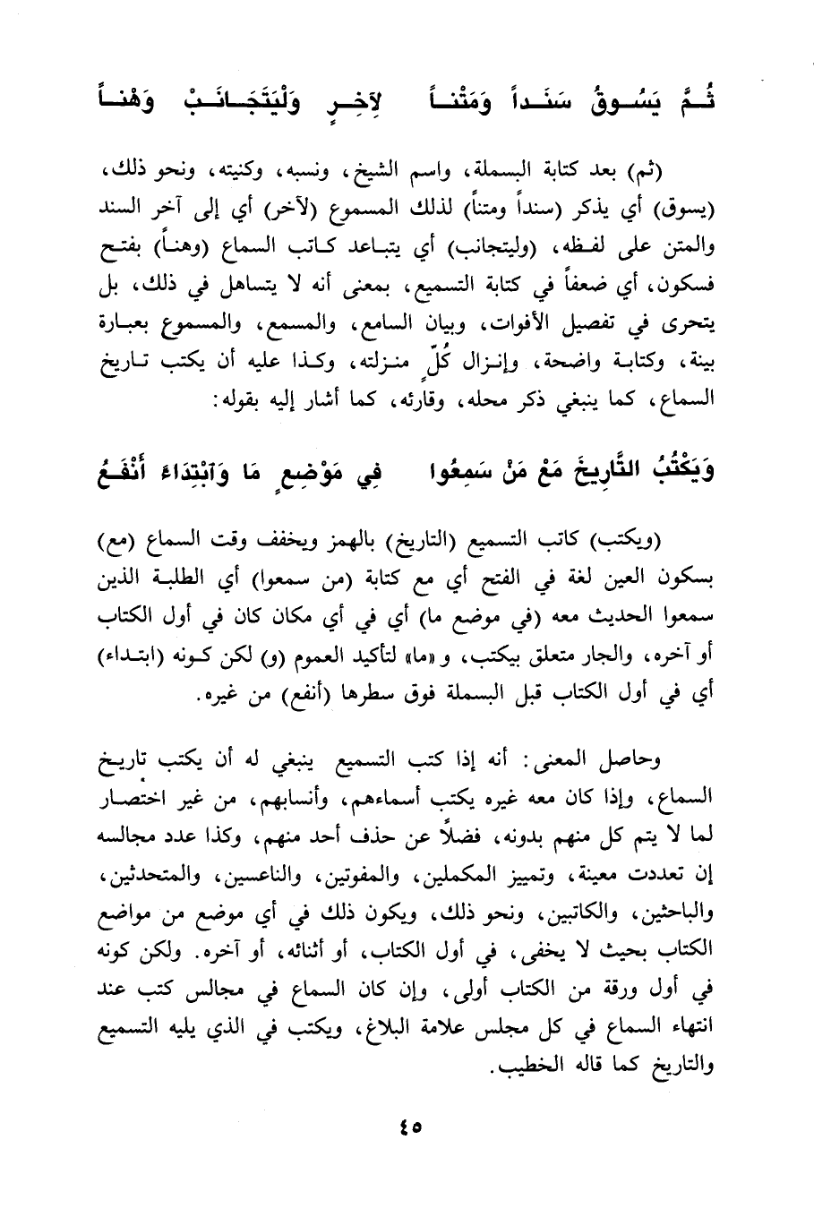 (ثم) بعد كتابة البسملة، واسم الشيخ، ونسبه، وكنيته، ونحو ذلك، (يسوق) أي يذكر (سنداً ومتناً) لذلك المسموع (لآخر) أي إلى آخر السَّند والمتن على لفظه، (وليتجانب) أي يتباعد كاتب السماع (وهناً) بفتح فسكون، أي ضعفاً في كتابة التسميع، بمعنى أنه لا يتساهل في ذلك، بل يتحرى في تفصيل الأفوات، وبيان السامع، والمسمع، والمسموع بعبارة بينة، وكتابة واضحة، وإنزال كُلٍّ منزلته، وكذا عليه أن يكتب تاريخ السماع، كما ينبغي ذكر محله، وقارئه، كما أشار إليه بقوله: