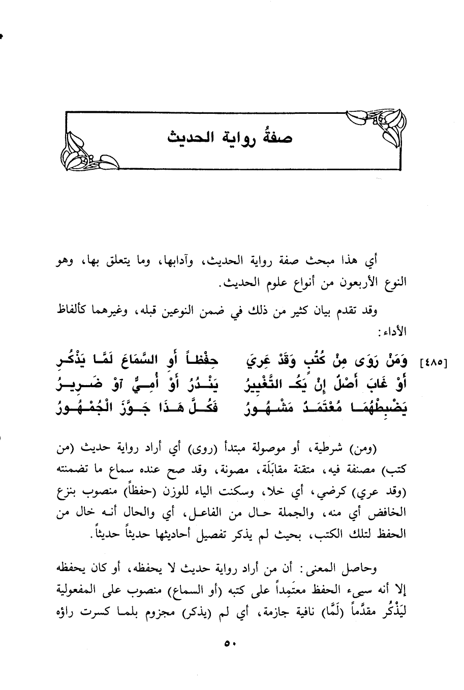 (ومَن) شرطية، أو موصولة مبتدأ (روى) أي أراد رواية حديث (من كتب) مصنفة فيه، متقنة مقابَلَة، مصونة، وقد صح عنده سماع ما تضمنته (وقد عري) كرضي، أي خلا، وسكنت الياء للوزن (حفظاً) منصوب بنزع الخافض أي منه، والجملة حال من الفاعل، أي والحال أنه خال من الحفظ لتلك الكتب، بحيث لم يذكر تفصيل أحاديثها حديثاً حديثاً.