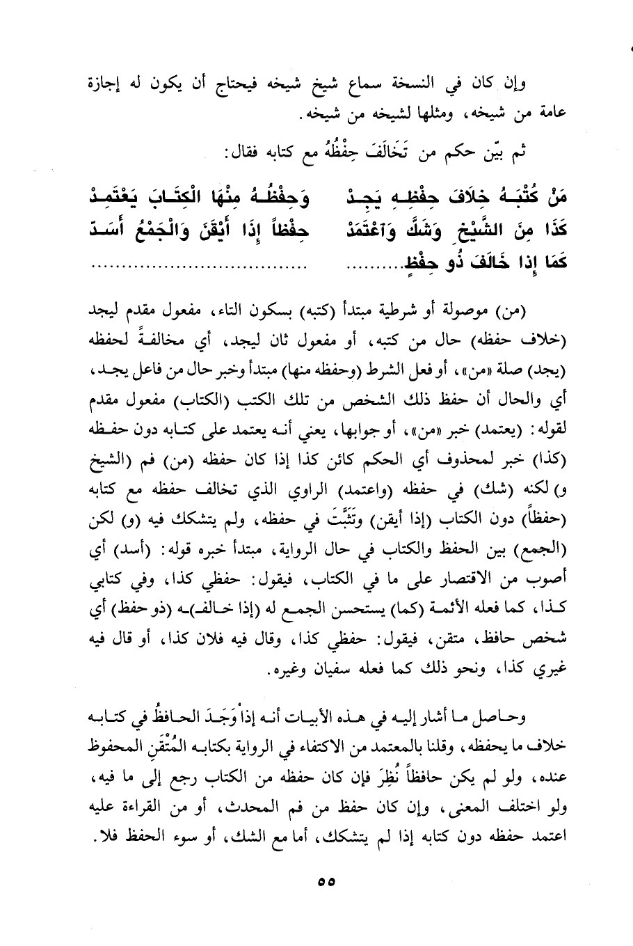 (من) موصولة أو شرطية مبتدأ (كتبه) بسكون التاء، مفعول مقدم ليجد (خلاف حفظه) حال من كتبه، أو مفعول ثان ليجد، أي مخالفةً لحفظه (يجد) صلة " من "، أوفعل الشرط (وحفظه منها) مبتدأ وخبر حال من فاعل يجد، أي والحال أن حفظ ذلك الشخص من تلك الكتب (الكتاب) مفعول مقدم لقوله: (يعتمد) خبر " من "، أو جوابها، يعني أنه يعتمد على كتابه دون حفظه (كذا) خبر لمحذوف أي الحكم كائن كذا إذا كان حفظه (من) فم (الشيخ و) لكنه (شك) في حفظه (واعتمد) الراوي الذي تخالف حفظه مع كتابه (حفظاً) دون الكتاب (إذا أيقن) وتَثَبَّتَ في حفظه، ولم يتشكك فيه (و) لكن (الجمع) بين الحفظ والكتاب في حال الرواية، مبتدأ خبره قوله: (أسد) أي أصوب من الاقتصار على ما في الكتاب، فيقول: حفظي كذا، وفي كتابي كذا، كما فعله الأئمة (كما) يستحسن الجمع له (إذا خالفـ) ـه (ذو حفظ) أي شخص حافظ، متقن، فيقول: حفظي كذا، وقال فيه فلان كذا، أو قال فيه غيري كذا، ونحو ذلك كما فعله سفيان وغيره.