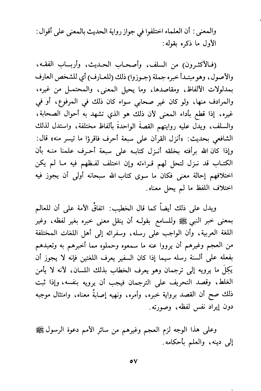 ويدل على ذلك أيضاً كما قال الخطيب: اتفاق الأمة على أن للعالم بمعنى خبر النبي - صلى الله عليه وسلم - وللسامع بقوله أن ينقل معنى خبره بغير لفظه، وغير اللغة العربية، وأن الواجب على رسله، وسفرائه إلى أهل اللغات المختلفة من العجم وغيرهم أن يرووا عنه ما سمعوه وحملوه مما أخبرهم به وتعبدهم بفعله على ألسنة رسله سيما إذا كان السفير يعرف اللغتين فإنه لا يجوز أن يَكِلَ ما يرويه إلى ترجمان وهو يعرف الخطاب بذلك اللسان، لأنه لا يأمن الغلط، وقصد التحريف على الترجمان فيجب أن يرويه بنفسه، وإذا ثبت ذلك صح أن القصد برواية خبره، وأمره، ونهيه إصابةُ معناه، وامتثال موجبه دون إيراد نفس لفظه، وصورته.