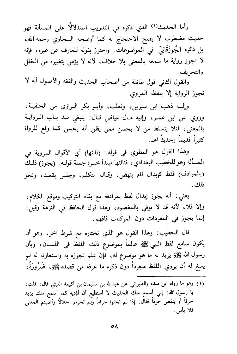 قال الخطيب: وهذا القول هو الذي نختاره مع شرط آخر، وهو أن يكون سامع لفظ النبي - صلى الله عليه وسلم - عالماً بموضوع ذلك اللفظ في اللسان، وبأن رسول الله - صلى الله عليه وسلم - يريد به ما هو موضوع له، فإن علم تجوزه به واستعارته له لم يسغ له أن يروي اللفظ مجرداً دون ذكره ما عرفه من قصده - صلى الله عليه وسلم - ضَرُورَةً.