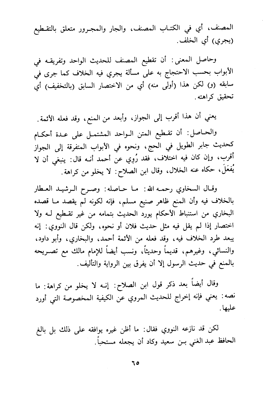 وقال السخاوي رحمه الله: ما حاصله: وصرح الرشيد العطار بالخلاف فيه وأن المنع ظاهر صنيع مسلم، فإنه لكونه لم يقصد ما قصده البخاري من استنباط الأحكام يورد الحديث بتمامه من غير تقطيع له ولا اختصار إذا لم يقل فيه مثل حديث فلان أو نحوه، ولكن قال النووي: إنه يبعد طرد الخلاف فيه، وقد فعله من الأئمة أحمد، والبخاري، وأبو داود، والنسائي، وغيرهم، قديماً وحديثاً، ونسب أيضاً للإمام مالك مع تصريحه بالمنع في حديث الرسول إلا أن يفرق بين الرواية والتأليف.