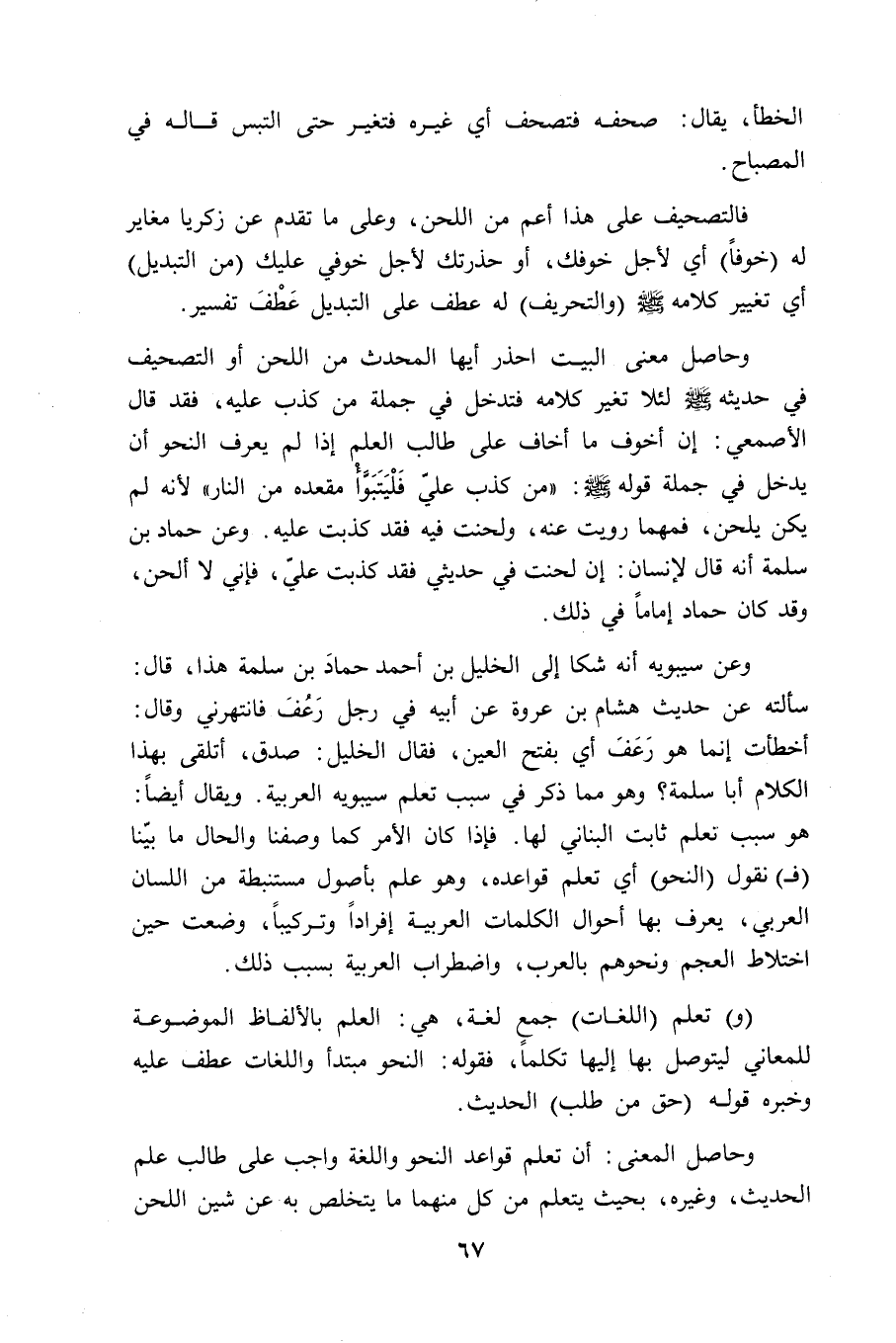 وحاصل معنى البيت احذر أيها المحدث من اللحن أو التصحيف في حديثه - صلى الله عليه وسلم - لئلا تغير كلامه فتدخل في جملة مَن كَذب عليه، فقد قال الأصمعي: إن أخوف ما أخاف على طالب العلم إذا لم يعرف النحو أن يدخل في جملة قوله - صلى الله عليه وسلم -: " من كذب عليَّ فَلْيَتَبَوَّا مقعده من النار " لأنه لم يكن يلحن، فمهما رويت عنه، ولحنت فيه فقد كذبت عليه. وعن حماد بن سلمة أنه قال لإنسان: إن لحنت في حديثي فقد كذبت عليّ، فإني لا ألحن، وقد كان حماد إماماً في ذلك.