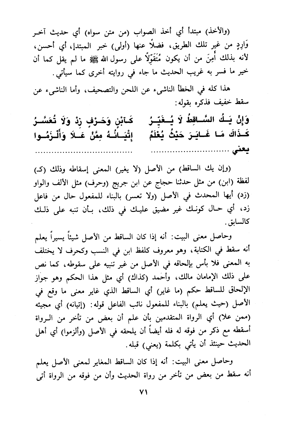 وحاصل معنى البيت: أنه إذا كان الساقط المغاير لمعنى الأصل يعلم أنه سقط من بعض من تأخر من رواة الحديث وأن من فوقه من الرواة أتى