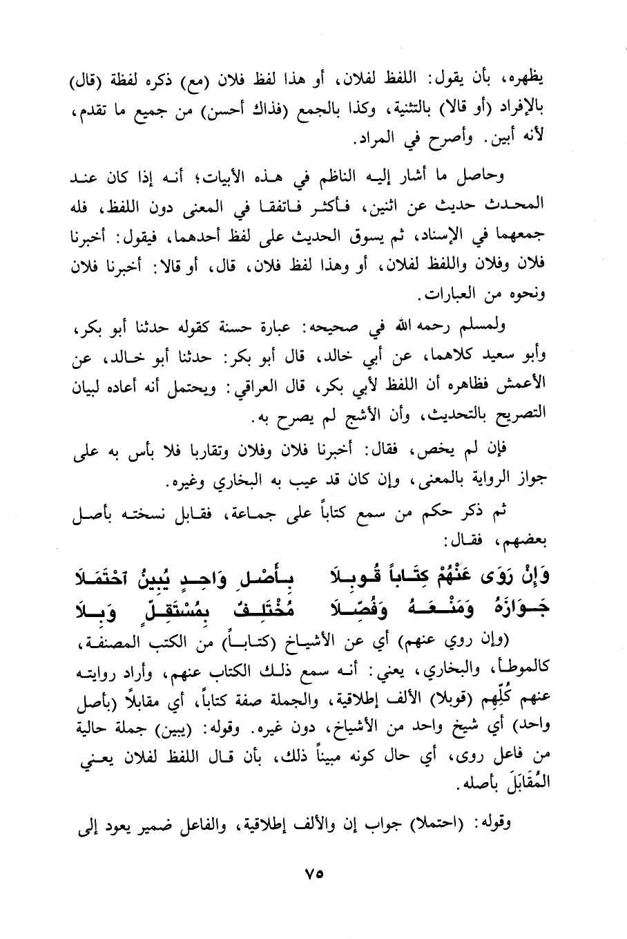 وحاصل ما أشار إليه الناظم في هذه الأبيات؛ أنه إذا كان عند المحدث حديث عن اثنين، فأكثر فاتفقا في المعنى دون اللفظ، فله جمعهما في الإسناد، ثم يسوق الحديث على لفظ أحدهما، فيقول: أخبرنا فلان وفلان واللفظ لفلان، أو وهذا لفظ فلان، قال، أو قالا: أخبرنا فلان ونحوه من العبارات.