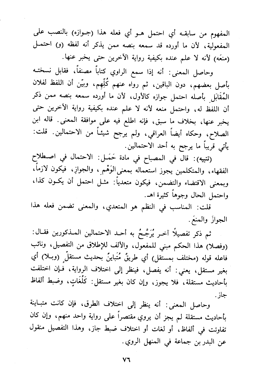 وحاصل المعنى: أنه إذا سمع الراوي كتاباً مصنفاً، فقابل نسخته بأصل بعضهم، دون الباقين، ثم رواه عنهم كُلِّهِم، وبيّن أن اللفظ لفلان المُقَابَلِ بأصله احتمل جوازه كالأول، لأن ما أورده سمعه بنصه ممن ذكر أن اللفظ له، واحتمل منعه لأنه لا علم عنده بكيفية رواية الآخرين حتى يخبر عنها، بخلاف ما سبق، فإنه اطلع فيه على موافقة المعنى. قاله ابن الصلاح، وحكاه أيضاً العراقي، ولم يرجح شيئاً من الاحتمالين. قلت: يأتي قريباً ما يرجح به أحد الاحتمالين.