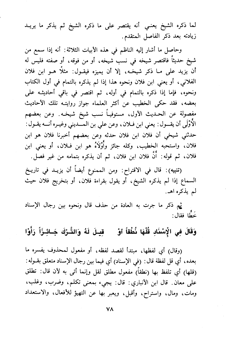 وحاصل ما أشار إليه الناظم في هذه الأبيات الثلاثة: أنه إذا سمع من شيخ حديثاً فاقتصر شيخه في نسب شيخه، أو من فوقه، أو صفته فليس له أن يزيد على ما ذكر شيخه، إلا أن يميزه فيقول: مثلاً هو ابن فلان الفلاني، أو يعني ابن فلان ونحوه هذا إذا لم يذكره بالتمام في أول الكتاب ونحوه، فإما إذا ذكره بالتمام في أوله، ثم اقتصر في باقي أحاديثه على بعضه، فقد حكى الخطيب عن أكثر العلماء جواز روايته تلك الأحاديث مفصولة عن الحديث الأول، مستوفياً نسب شيخ شيخه. وعن بعضهم الأوْلَى أن يقول: يعني ابن فلان، وعن علي بن المديني وغيره أنه يقول: حدثني شيخي أن فلان ابن فلان حدثه وعن بعضهم أخبرنا فلان هو ابن فلان، واستحبه الخطيب، وكله جائز وأوْلاَهُ هو ابن فلان، أو يعني ابن فلان، ثم قوله: أنَّ فلان ابن فلان، ثم أن يذكره بتمامه من غير فصل.