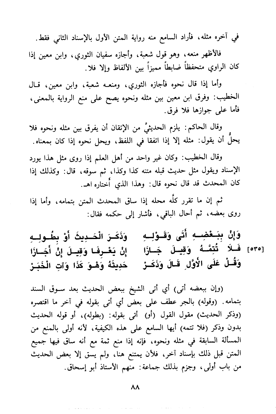 (وإن ببعضه أتى) أي أتى الشيخ ببعض الحديث بعد سوق السَّند بتمامه. (وقوله) بالجر عطف على بعض أي أتى بقوله في آخر ما اقتصره (وذكر الحديث) مقول القول (أو) أتى بقوله: (بطوله)، أو قوله الحديث بدون وذكر (فلا تتمه) أيها السامع على هذه الكيفية، لأنه أولى بالمنع من المسألة السابقة في مثله ونحوه، فإنه إذا منع ثمة مع أنه ساق فيها جميع المتن قبل ذلك بإسناد آخر، فلأن يمتنع هنا، ولم يسق إلا بعض الحديث من باب أولى، وجزم بذلك جماعة: منهم الأستاذ أبو إسحاق.