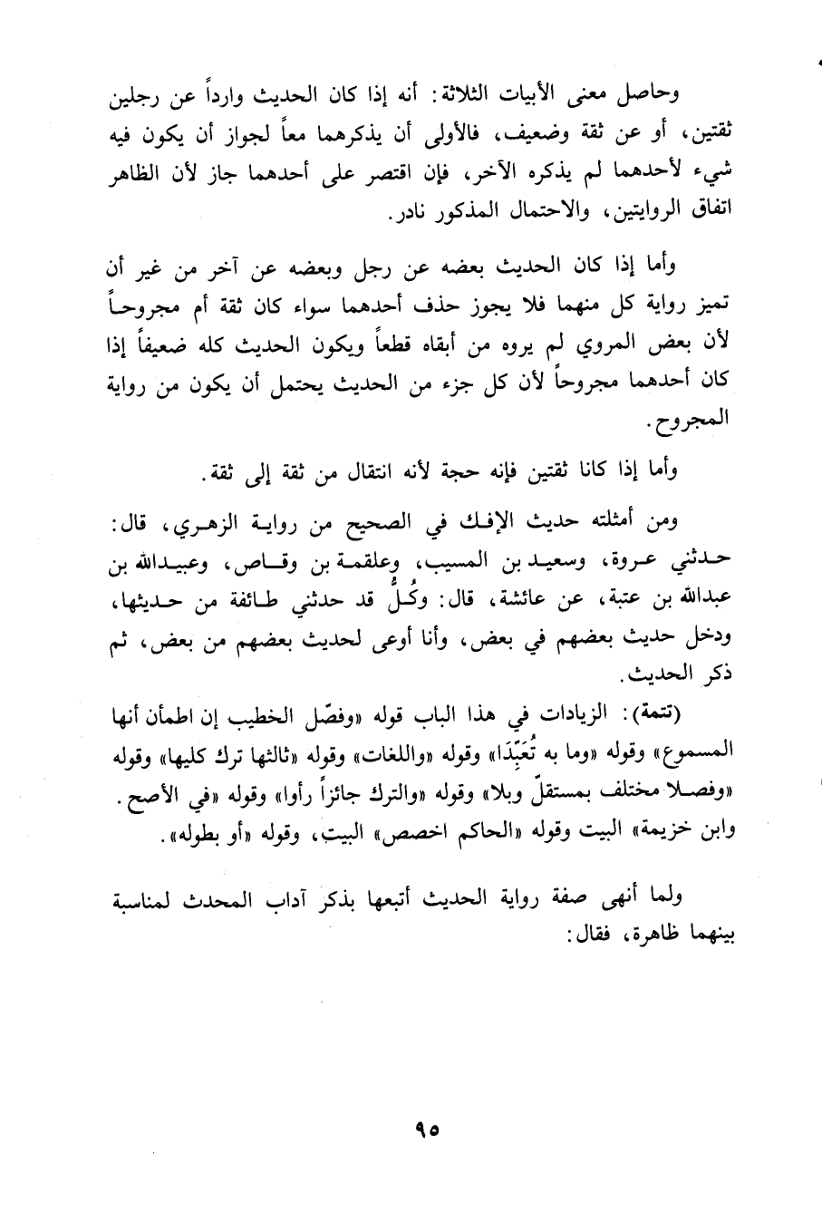وأما إذا كان الحديث بعضه عن رجل وبعضه عن آخر من غير أن تميز رواية كل منهما فلا يجوز حذف أحدهما سواء كان ثقة أم مجروحاً لأن بعض المروي لم يروه من أبقاه قطعاً ويكون الحديث كله ضعيفاً إذا كان أحدهما مجروحاً لأن كل جزء من الحديث يحتمل أن يكون من رواية المجروح.