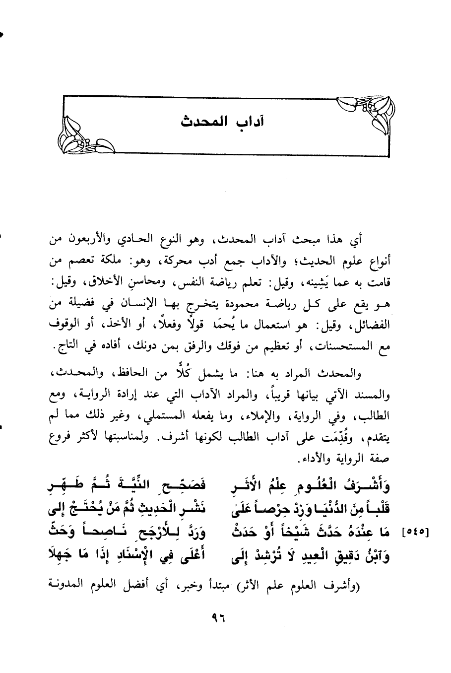 أي هذا مبحث آداب المحدث، وهو النوع الحادي والأربعون من أنواع علوم الحديث؛ والآداب جمع أدب محركة، وهو: ملكة تعصم من قامت به عما يَشِينه، وقيل: تعلم رياضة النفس، ومحاسنِ الأخلاق، وقيل: هو يقع على كل رياضة محمودة يتخرج بها الإنسان في فضيلة من الفضائل، وقيل: هو استعمال ما يُحمَد قولا وفعلًا، أو الأخذ، أو الوقوف مع المستحسنات، أو تعظيم من فوقك والرفق بمن دونك، أفاده في التاج.