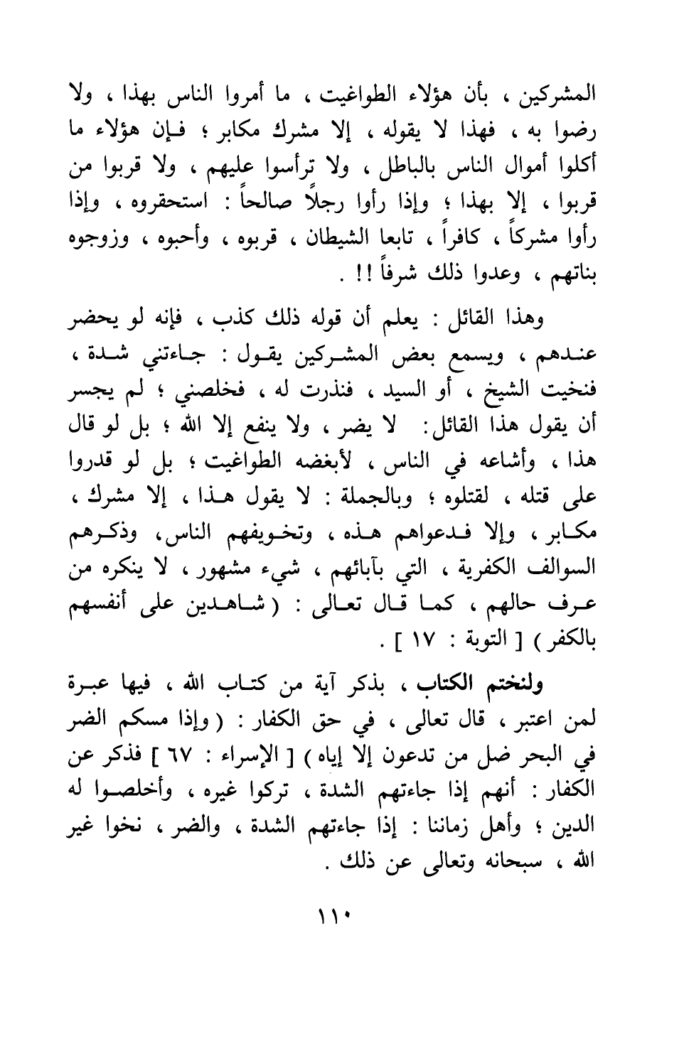 ولنختم الكتاب، بذكر آية من كتاب الله، فيها عبرة لمن اعتبر، قال تعالى في حق الكفار: {وَإِذَا مَسَّكُمُ الضُّرُّ فِي الْبَحْرِ ضَلَّ مَنْ تَدْعُونَ إِلَّا إِيَّاهُ} [سورة الإسراء آية: 67] ، فذكر عن الكفار أنهم إذا جاءتهم الشدة تركوا غيره، وأخلصوا له الدين; وأهل زماننا إذا جاءتهم الشدة والضر، نخوا غير الله، سبحانه وتعالى عن ذلك.