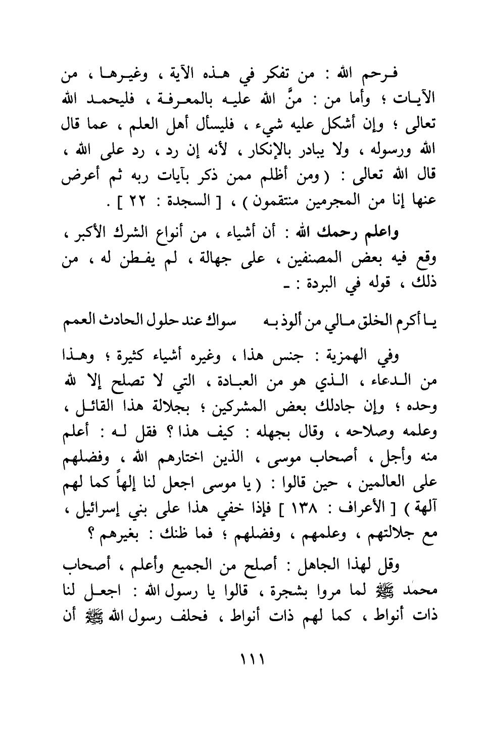 واعلم رحمك الله أن أشياء من أنواع الشرك الأكبر وقع فيه بعض المصنفين على جهالة، لم يفطن له، من ذلك، قوله في البردة: