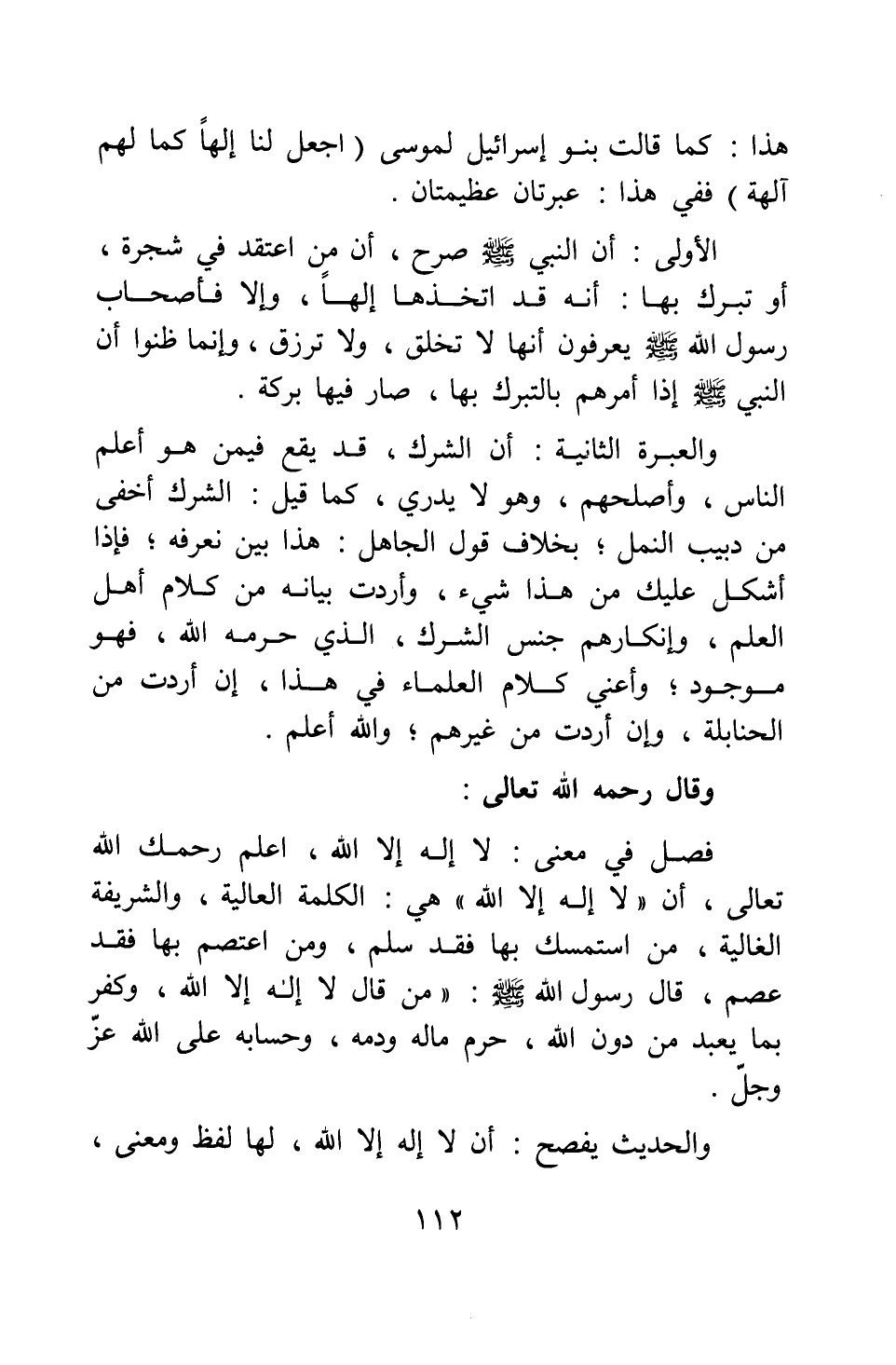 والعبرة الثانية: أن الشرك قد يقع فيمن هو أعلم الناس، وأصلحهم، وهو لا يدري، كما قيل: الشرك أخفى من دبيب النمل; بخلاف قول الجاهل: هذا بين نعرفه; فإذا أشكل عليك من هذا شيء، وأردت بيانه من كلام أهل العلم، وإنكارهم جنس الشرك، الذي حرمه الله، فهو موجود; وأعني كلام العلماء في هذا، إن أردت من الحنابلة، وإن أردت من غيرهم; والله أعلم.