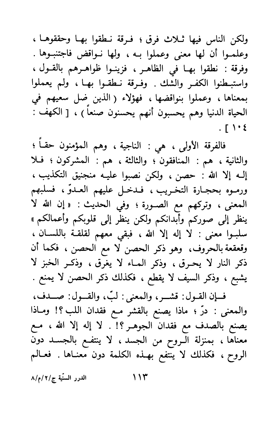 ولكن الناس فيها ثلاث فرق: فرقة نطقوا بها وحققوها، وعلموا أن لها معنى وعملوا به، ولها نواقض فاجتنبوها. وفرقة: نطقوا بها في الظاهر، فزينوا ظواهرهم بالقول، واستبطنوا الكفر والشك. وفرقة: نطقوا بها ولم يعملوا بمعناها، وعملوا بنواقضها، فهؤلاء {الَّذِينَ ضَلَّ سَعْيُهُمْ فِي الْحَيَاةِ الدُّنْيَا وَهُمْ يَحْسَبُونَ أَنَّهُمْ يُحْسِنُونَ صُنْعاً} [سورة الكهف آية: 104] .
