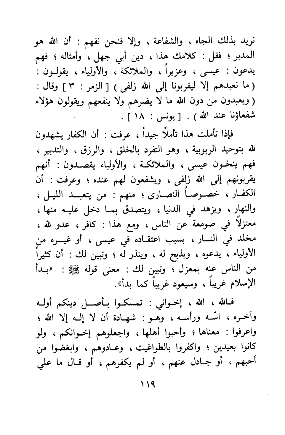 فإذا تأملت هذا تأملا جيدا، عرفت أن الكفار يشهدون لله بتوحيد الربوبية، وهو التفرد بالخلق، والرزق، والتدبير؛ فهم ينخون عيسى، والملائكة، والأولياء يقصدون أنهم يقربونهم إلى الله زلفى، ويشفعون لهم عنده; وعرفت أن الكفار، خصوصا النصارى منهم من يتعبد الليل والنهار، ويزهد في الدنيا، ويتصدق بما دخل عليه منها، معتزلا في صومعة عن الناس، ومع هذا كافر، عدو لله، مخلد في النار، بسبب اعتقاده في عيسى أو غيره من الأولياء، يدعوه، ويذبح له، وينذر له; وتبين لك أن كثيرا من الناس عنه بمعزل; وتبين لك: معنى قوله صلى الله عليه وسلم: " بدأ الإسلام غريبا، وسيعود غريبا كما بد أ"1.