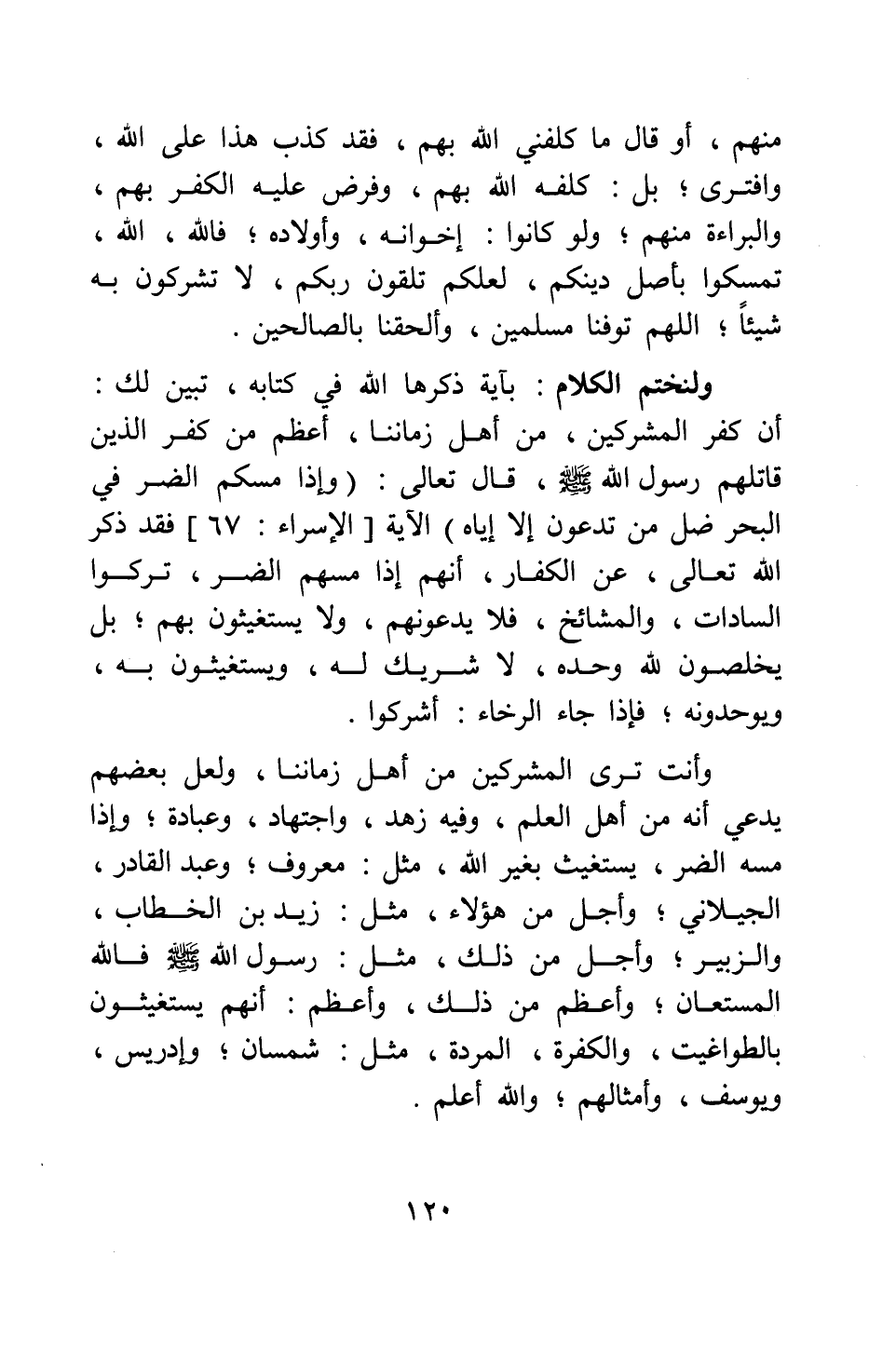 ولنختم الكلام بآية ذكرها الله في كتابه، تبين لك أن كفر المشركين من أهل زماننا، أعظم من كفر الذين قاتلهم رسول الله صلى الله عليه وسلم. قال تعالى: {وَإِذَا مَسَّكُمُ الضُّرُّ فِي الْبَحْرِ ضَلَّ مَنْ تَدْعُونَ إِلَّا إِيَّاهُ} الآية [سورة الإسراء آية: 67] ، فقد ذكر الله تعالى عن الكفار، أنهم إذا مسهم الضر تركوا السادات والمشائخ، فلا يدعونهم، ولا يستغيثون بهم، بل يخلصون لله وحده لا شريك له، ويستغيثون به ويوحدونه; فإذا جاء الرخاء أشركوا.