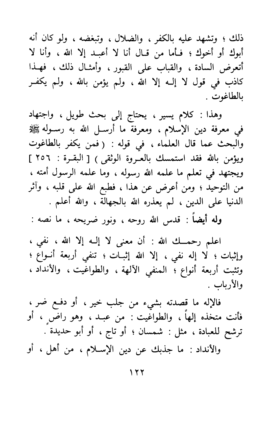 وهذا كلام يسير، يحتاج إلى بحث طويل، واجتهاد في معرفة دين الإسلام، ومعرفة ما أرسل الله به رسوله صلى الله عليه وسلم، والبحث عما قال العلماء، في قوله: {فَمَنْ يَكْفُرْ بِالطَّاغُوتِ وَيُؤْمِنْ بِاللَّهِ فَقَدِ اسْتَمْسَكَ بِالْعُرْوَةِ الْوُثْقَى} [سورة البقرة آية: 256] ، ويجتهد في تعلم ما علمه الله رسوله، وما علمه الرسول أمته من التوحيد; ومن أعرض عن هذا فطبع الله على قلبه، وآثر الدنيا على الدين، لم يعذره الله بالجهالة، والله أعلم.