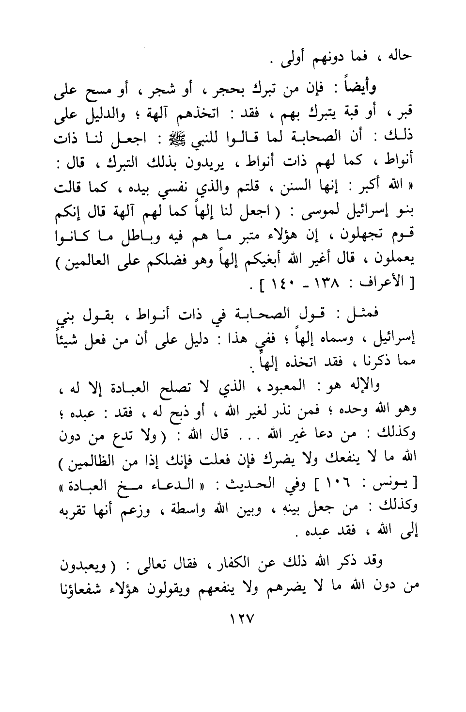 وأيضا فإن من تبرك بحجر، أو شجر، أو مسح على قبر أو قبة يتبرك بهم، فقد اتخذهم آلهة; والدليل على ذلك أن الصحابة لما قالوا للنبي صلى الله عليه وسلم اجعل لنا ذات أنواط، كما لهم ذات أنواط، يريدون بذلك التبرك، قال: "الله أكبر: إنها السنن، قلتم والذي نفسي بيده، كما قالت بنو إسرائيل لموسى: {اجْعَلْ لَنَا إِلَهاً كَمَا لَهُمْ آلِهَةٌ قَالَ إِنَّكُمْ قَوْمٌ تَجْهَلُونَ إِنَّ هَؤُلاءِ مُتَبَّرٌ مَا هُمْ فِيهِ وَبَاطِلٌ مَا كَانُوا يَعْمَلُونَ قَالَ أَغَيْرَ اللَّهِ أَبْغِيكُمْ إِلَهاً وَهُوَ فَضَّلَكُمْ عَلَى الْعَالَمِينَ} [سورة الأعراف آية: 136"137] ".