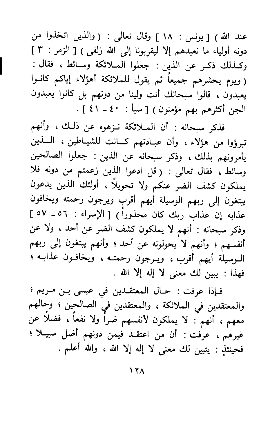 فذكر سبحانه: أن الملائكة نزهوه عن ذلك، وأنهم تبرؤوا من هؤلاء، وأن عبادتهم كانت للشياطين، الذين يأمرونهم بذلك، وذكر سبحانه عن الذين جعلوا الصالحين وسائط، فقال تعالى: {قُلِ ادْعُوا الَّذِينَ زَعَمْتُمْ مِنْ دُونِهِ فَلا يَمْلِكُونَ كَشْفَ الضُّرِّ عَنْكُمْ وَلا تَحْوِيلاً أُولَئِكَ الَّذِينَ يَدْعُونَ يَبْتَغُونَ إِلَى رَبِّهِمُ الْوَسِيلَةَ أَيُّهُمْ أَقْرَبُ وَيَرْجُونَ رَحْمَتَهُ وَيَخَافُونَ عَذَابَهُ إِنَّ عَذَابَ رَبِّكَ كَانَ مَحْذُوراً} [سورة الإسراء آية: 57"56] ، وذكر سبحانه: أنهم لا يملكون كشف الضر عن أحد، ولا عن أنفسهم، وأنهم لا يحولونه عن أحد; وأنهم يبتغون إلى ربهم الوسيلة أيهم أقرب، ويرجون رحمته، ويخافون عذابه; فهذا يبين لك معنى لا إله إلا الله.