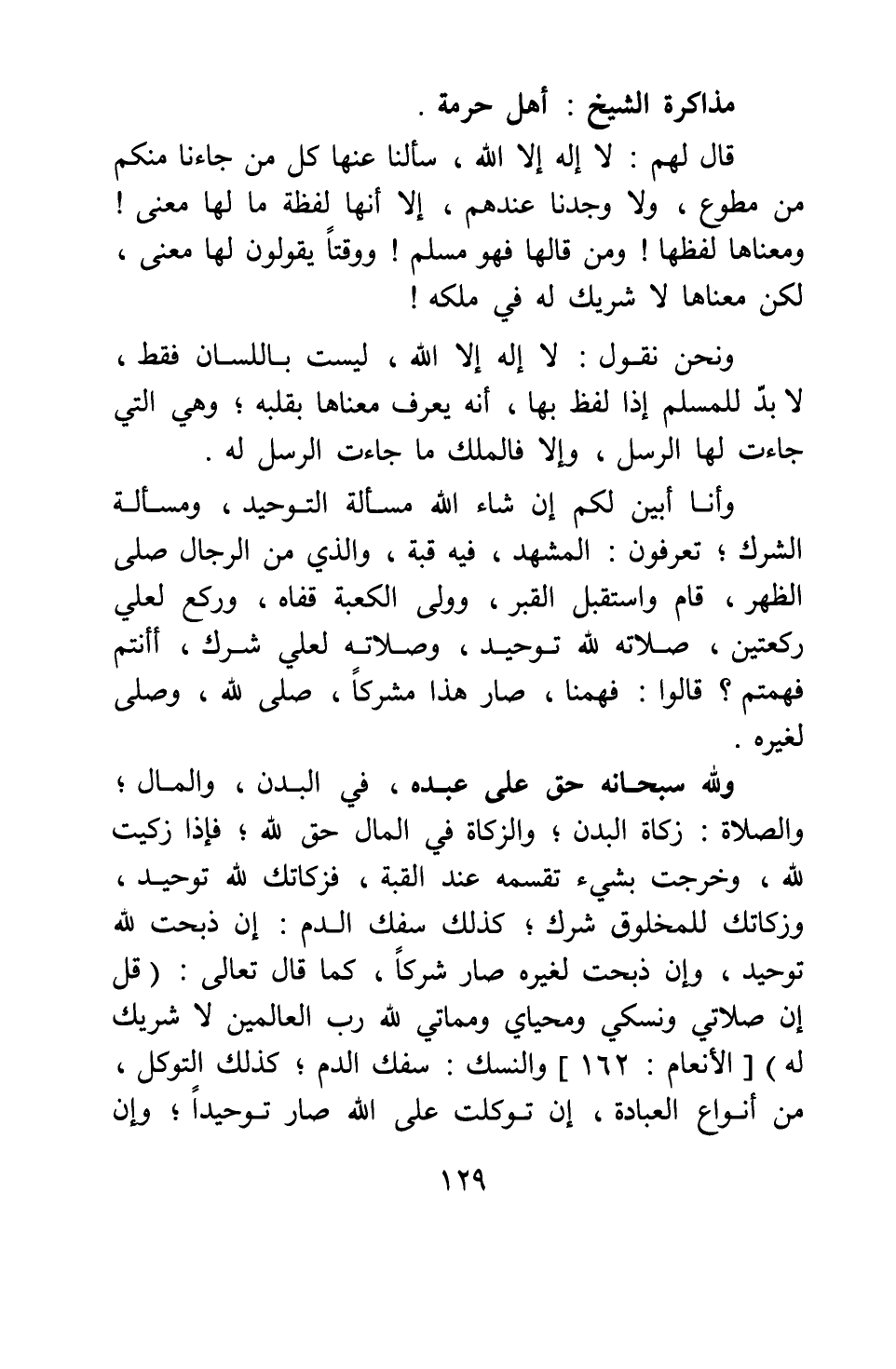 قال لهم: لا إله إلا الله، سألنا عنها كل من جاءنا منكم من مطوع، ولا وجدنا عندهم، إلا أنها لفظة ما لها معنى! ومعناها لفظها! ومن قالها فهو مسلم! ووقتا يقولون لها معنى، لكن معناها لا شريك له في ملكه!