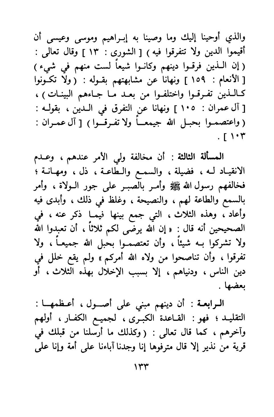 المسألة الثالثة: أن مخالفة ولي الأمر عندهم، وعدم الانقياد له، فضيلة، والسمع والطاعة ذل ومهانة; فخالفهم رسول الله صلى الله عليه وسلم وأمر بالصبر على جور الولاة، وأمر بالسمع والطاعة لهم، والنصيحة، وغلظ في ذلك، وأبدى فيه وأعاد. وهذه الثلاث التي جمع بينها فيما ذكر عنه، في الصحيحين أنه قال: " إن الله يرضى لكم ثلاثا، أن تعبدوا الله ولا تشركوا به شيئا، وأن تعتصموا بحبل الله جميعا ولا تفرقوا، وأن تناصحوا من ولاه الله أمركم "1 ولم يقع خلل في دين الناس، ودنياهم، إلا بسبب الإخلال بهذه الثلاث، أو بعضها.