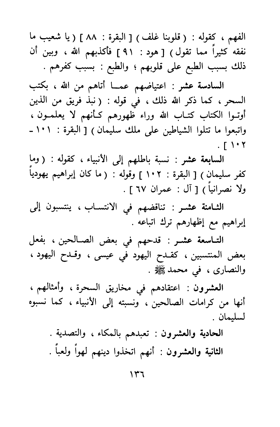 السابعة عشر: نسبة باطلهم إلى الأنبياء، كقوله: {وَمَا كَفَرَ سُلَيْمَانُ} [سورة البقرة آية: 102] ، وقوله: {مَا كَانَ إِبْرَاهِيمُ يَهُودِيّاً وَلا نَصْرَانِيّاً} [سورة آل عمران آية: 67] .