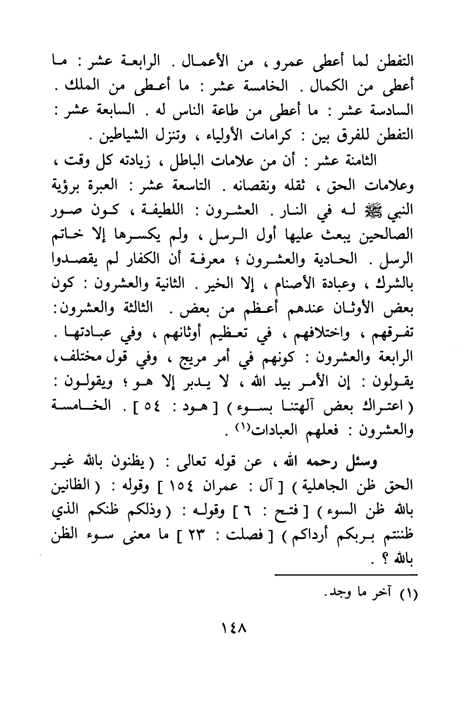 العشرون: اللطيفة: كون صور الصالحين يبعث عليها أول الرسل، ولم يكسرها إلا خاتم الرسل. الحادية والعشرون: معرفة أن الكفار لم يقصدوا بالشرك وعبادة الأصنام إلا الخير. الثانية والعشرون: كون بعض الأوثان عندهم أعظم من بعض. الثالثة والعشرون: تفرقهم واختلافهم، في تعظيم أوثانهم وفي عبادتها. الرابعة والعشرون: كونهم في أمر مريج وفي قول مختلف، يقولون: إن الأمر بيد الله لا يدبر إلا هو، ويقولون: {اعْتَرَاكَ بَعْضُ آلِهَتِنَا بِسُوءٍ} [سورة هود آية: 54] . الخامسة والعشرون: فعلهم العبادات1.
