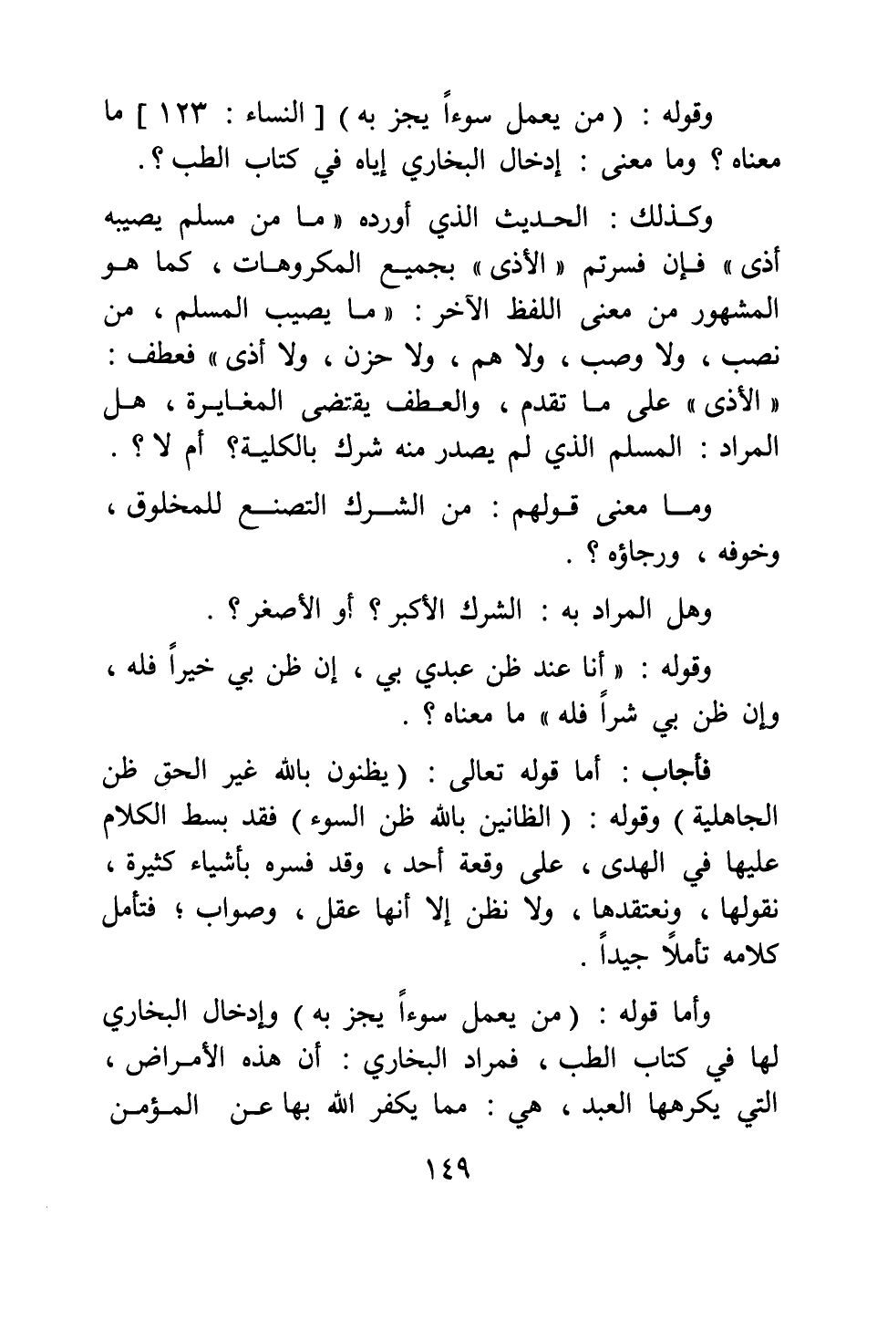 وأما قوله: {مَنْ يَعْمَلْ سُوءاً يُجْزَ بِهِ} [سورة النساء آية: 123] ، وإدخال البخاري لها في كتاب الطب، فمراد البخاري: أن هذه الأمراض، التي يكرهها العبد، هي مما يكفر الله بها عن المؤمن