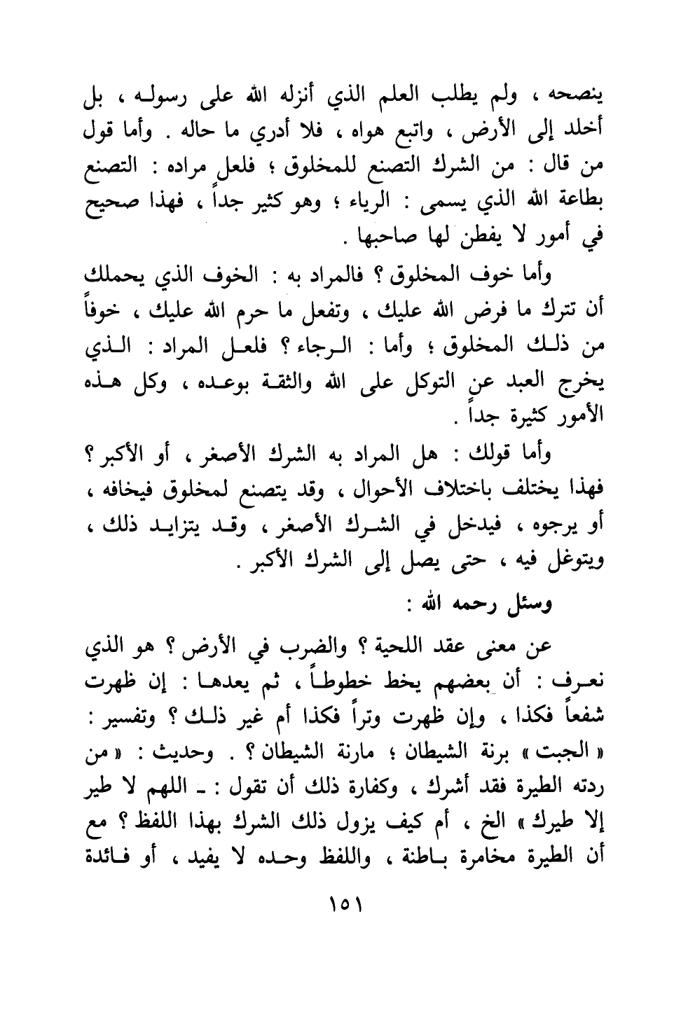 عن معنى عقد اللحية؟ والضرب في الأرض؟ هو الذي نعرف: أن بعضهم يخط خطوطا، ثم يعدها: إن ظهرت شفعا فكذا، وإن ظهرت وترا فكذا، أم غير ذلك؟ وتفسير: "الجبت" برنة الشيطان; ما رنة الشيطان؟. وحديث: "من ردته الطيرة فقد أشرك، وكفارة ذلك أن تقول: اللهم لا طير إلا طيرك" إلخ، أم كيف يزول ذلك الشرك بهذا اللفظ؟ مع أن الطيرة مخامرة باطنة، واللفظ وحده لا يفيد، أو فائدة
