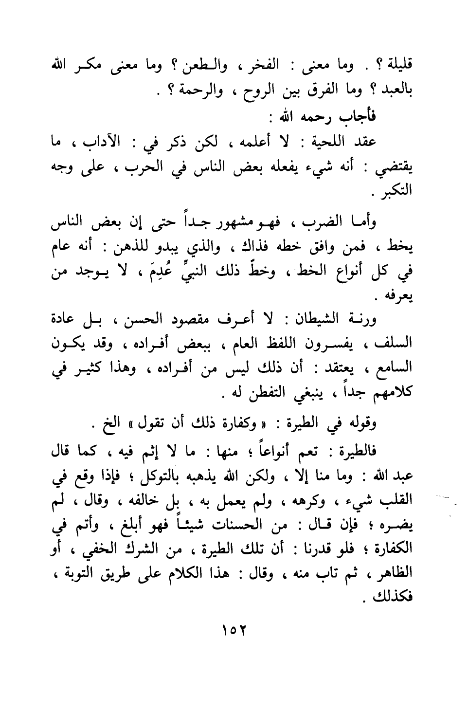 فأجاب رحمه الله: عقد اللحية: لا أعلمه، لكن ذكر في الآداب ما يقتضي أنه شيء يفعله بعض الناس في الحرب، على وجه التكبر. وأما الضرب، فهو مشهور جدا حتى إن بعض الناس يخط، فمن وافق خطه فذاك، والذي يبدو للذهن: أنه عام في كل أنواع الخط، وخط ذلك النبيِّ عُدِمَ، لا يوجد من يعرفه.