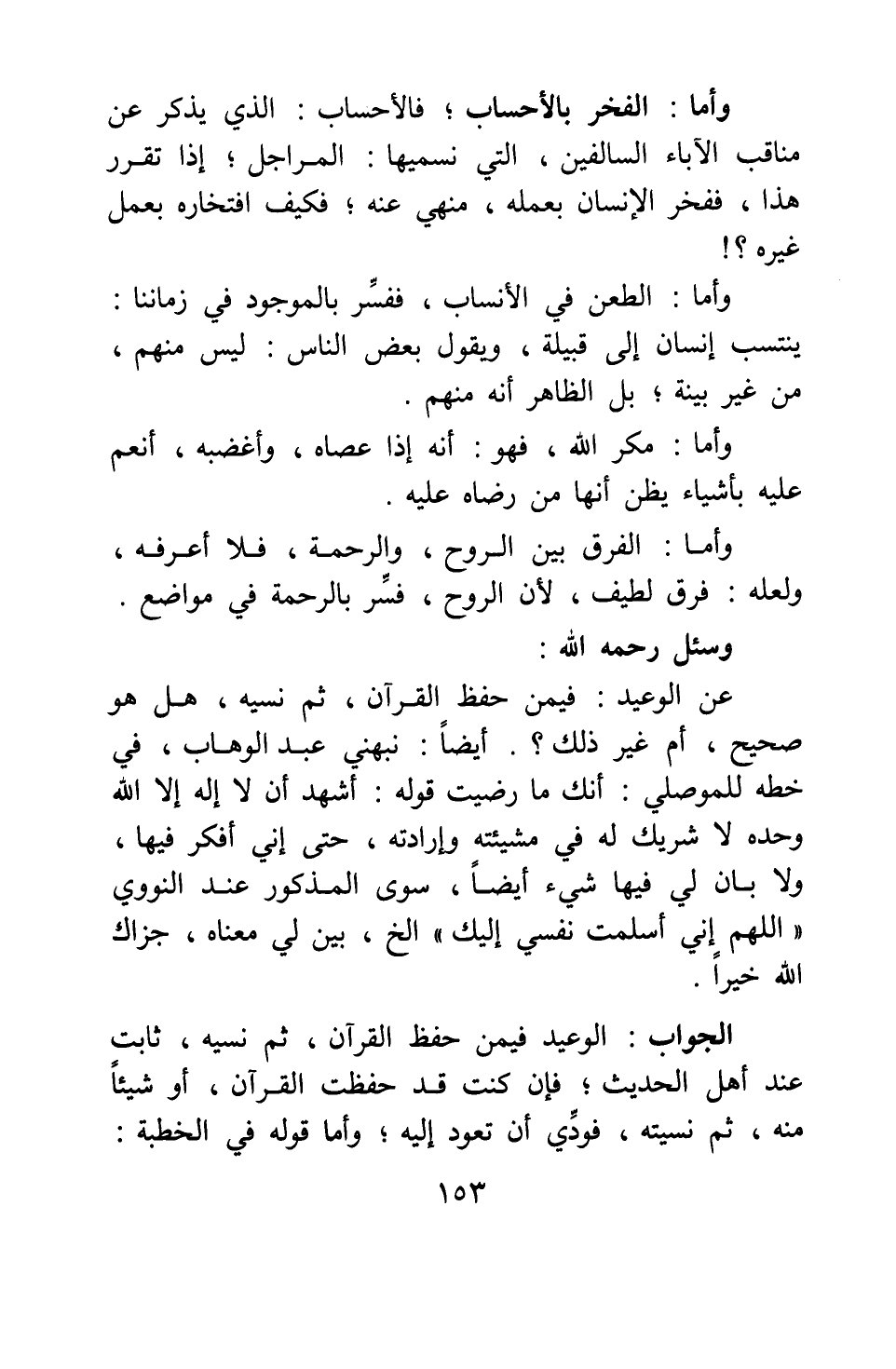 عن الوعيد فيمن حفظ القرآن ثم نسيه، هل هو صحيح، أم غير ذلك؟. أيضا نبهني عبد الوهاب في خطه للموصلي: أنك ما رضيت قوله: أشهد أن لا إله إلا الله وحده لا شريك له في مشيئته وإرادته، حتى إني أفكر فيها، ولا بان لي فيها شيء أيضا، سوى المذكور عند النووي: