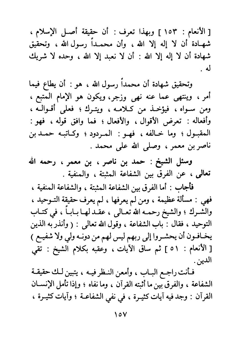 وتحقيق شهادة أن محمدا رسول الله، هو أن يطاع فيما أمر، وينتهى عما عنه نهى وزجر، ويكون هو الإمام المتبع، ومن سواه فيؤخذ من كلامه ويترك; فعلى أقواله وأفعاله: تعرض الأقوال والأفعال; فما وافق قوله، فهو: المقبول; وما خالفه فهو المردود; وكاتبه حمد بن ناصر بن معمر، وصلى الله على محمد.