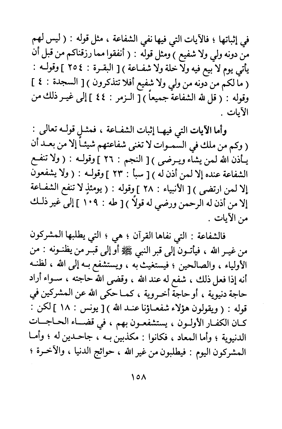 فالشفاعة التي نفاها القرآن هي; التي يطلبها المشركون من غير الله، فيأتون إلى قبر النبي صلى الله عليه وسلم أو إلى قبر من يظنونه من الأولياء والصالحين; فيستغيث به، ويستشفع به إلى الله، لظنه أنه إذا فعل ذلك شفع له عند الله، وقضى الله حاجته، سواء أراد حاجة دنيوية أو حاجة أخروية، كما حكى الله عن المشركين في قوله: {وَيَقُولُونَ هَؤُلاءِ شُفَعَاؤُنَا عِنْدَ اللَّهِ} [سورة يونس آية: 18] ، لكن كان الكفار الأولون، يستشفعون بهم في قضاء الحاجات الدنيوية; وأما المعاد، فكانوا مكذبين به، جاحدين له; وأما المشركون اليوم فيطلبون من غير الله حوائج الدنيا والآخرة;