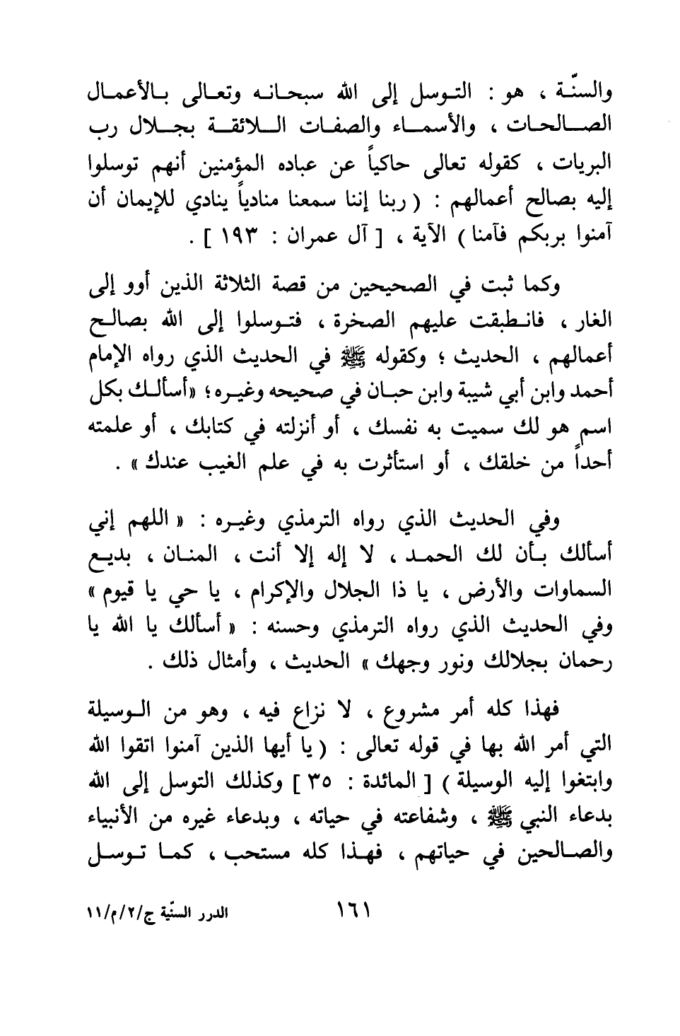فهذا كله أمر مشروع، لا نزاع فيه، وهو من الوسيلة التي أمر الله بها في قوله تعالى: {يَا أَيُّهَا الَّذِينَ آمَنُوا اتَّقُوا اللَّهَ وَابْتَغُوا إِلَيْهِ الْوَسِيلَةَ} [سورة المائدة آية: 35] .