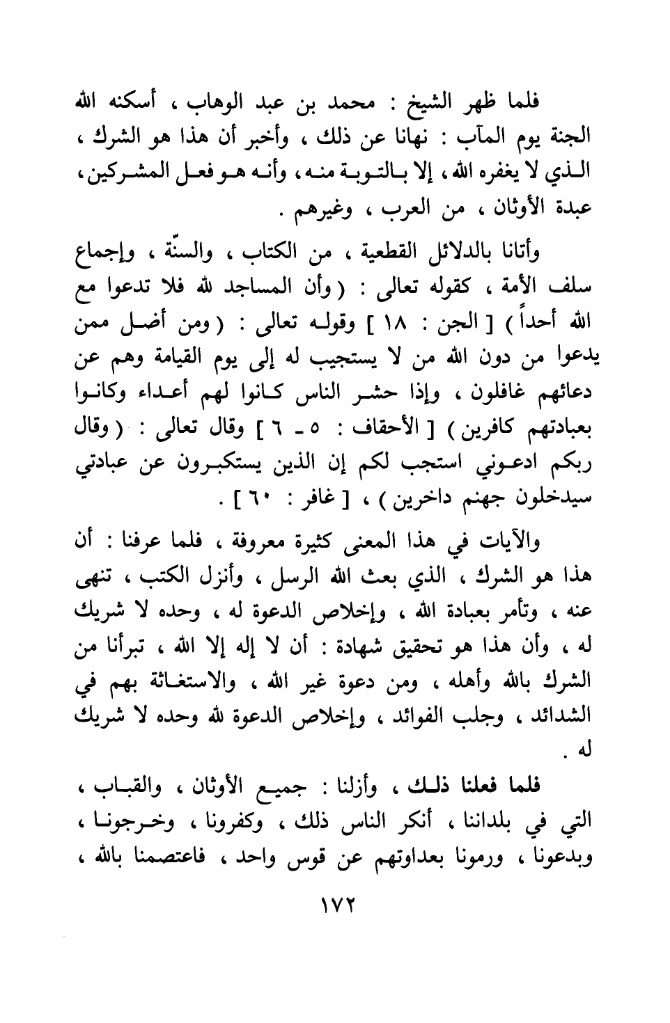 فلما ظهر الشيخ: محمد بن عبد الوهاب، أسكنه الله الجنة يوم المآب نهانا عن ذلك، وأخبر أن هذا هو الشرك الذي لا يغفره الله، إلا بالتوبة منه، وأنه هو فعل المشركين عبدة الأوثان، من العرب وغيرهم.