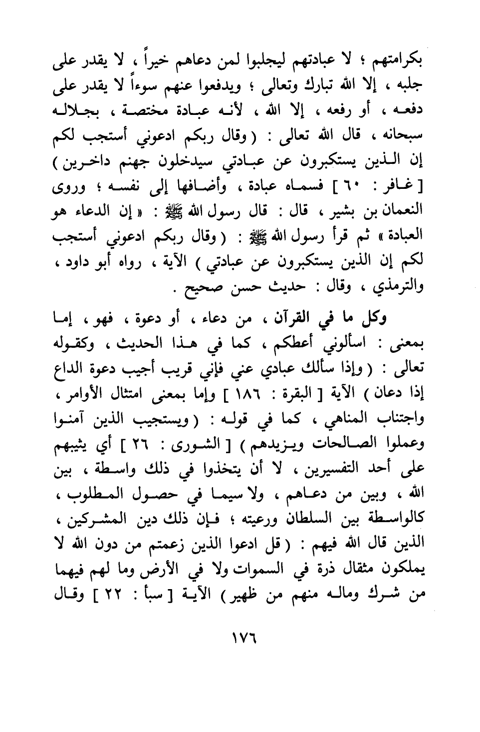 وكل ما في القرآن، من دعاء، أو دعوة، فهو إما بمعنى: اسألوني أعطكم، كما في هذا الحديث، وكقوله تعالى: {وَإِذَا سَأَلَكَ عِبَادِي عَنِّي فَإِنِّي قَرِيبٌ أُجِيبُ دَعْوَةَ الدَّاعِ إِذَا دَعَانِ} الآية [سورة البقرة آية: 186] . وإما بمعنى: امتثال الأوامر، واجتناب المناهي، كما في قوله: {وَيَسْتَجِيبُ الَّذِينَ آمَنُوا وَعَمِلُوا الصَّالِحَاتِ وَيَزِيدُهُمْ} [سورة الشورى آية: 26] ، أي يثيبهم على أحد التفسيرين، لا أن يتخذوا في ذلك واسطة، بين الله، وبين من دعاهم، ولا سيما في حصول المطلوب، كالواسطة بين السلطان ورعيته; فإن ذلك دين المشركين الذين قال الله فيهم: {قُلِ ادْعُوا الَّذِينَ زَعَمْتُمْ مِنْ دُونِ اللَّهِ لا يَمْلِكُونَ مِثْقَالَ ذَرَّةٍ فِي السَّمَاوَاتِ وَلا فِي الْأَرْضِ وَمَا لَهُمْ فِيهِمَا مِنْ شِرْكٍ وَمَا لَهُ مِنْهُمْ مِنْ ظَهِيرٍ} الآية [سورة سبأ آية: 22] . وقال
