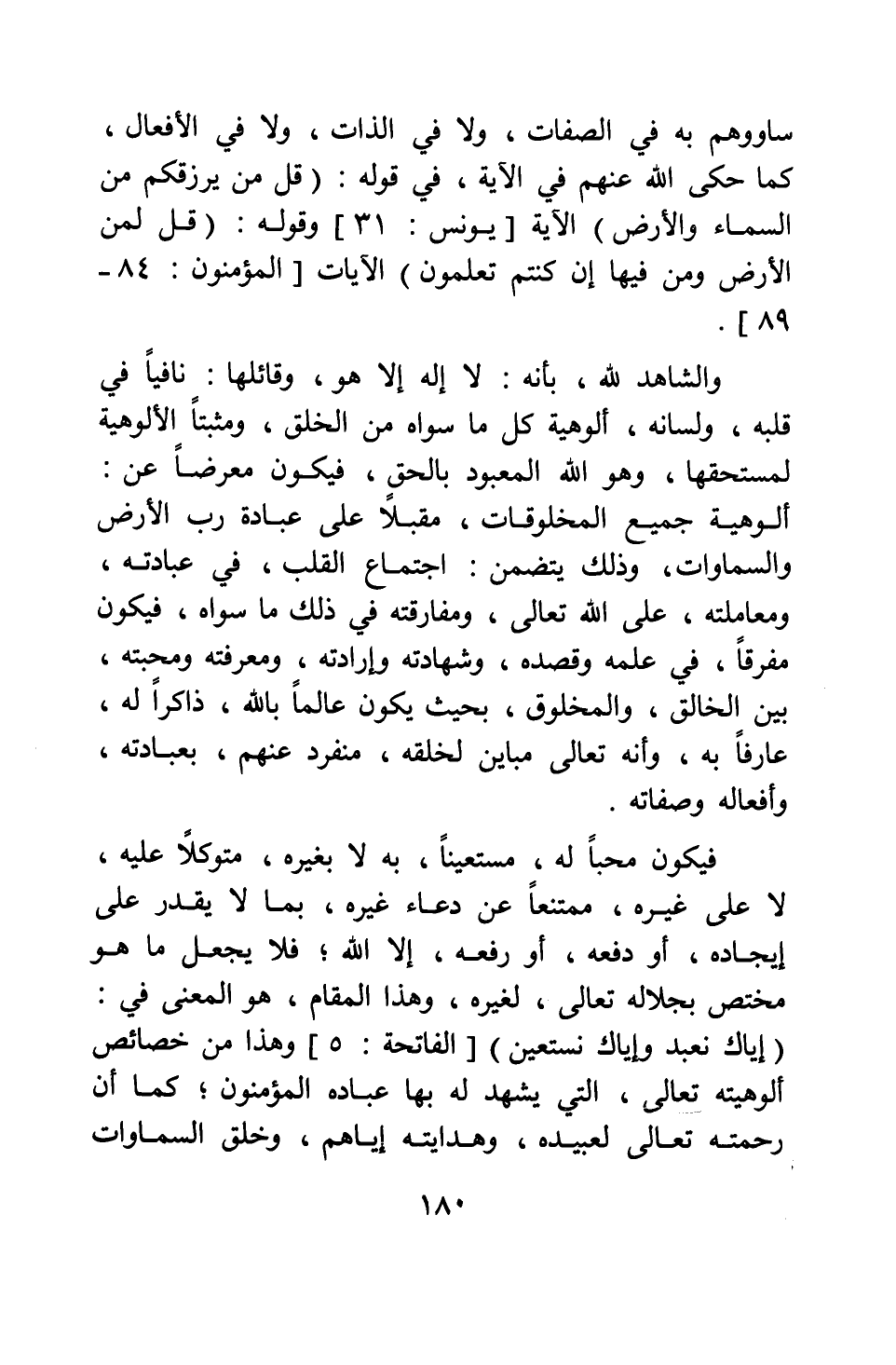 فيكون محبا له، مستعينا، به لا بغيره، متوكلا عليه لا على غيره، ممتنعا عن دعاء غيره، بما لا يقدر على إيجاده أو دفعه أو رفعه إلا الله; فلا يجعل ما هو مختص بجلاله تعالى، لغيره وهذا المقام، هو لمعنى في: {إِيَّاكَ نَعْبُدُ وَإِيَّاكَ نَسْتَعِينُ} [سورة الفاتحة آية: 5] ؛ وهذا من خصائص ألوهيته تعالى، التي يشهد له بها عباده المؤمنون; كما أن رحمته تعالى لعبيده، وهدايته إياهم، وخلق السماوات