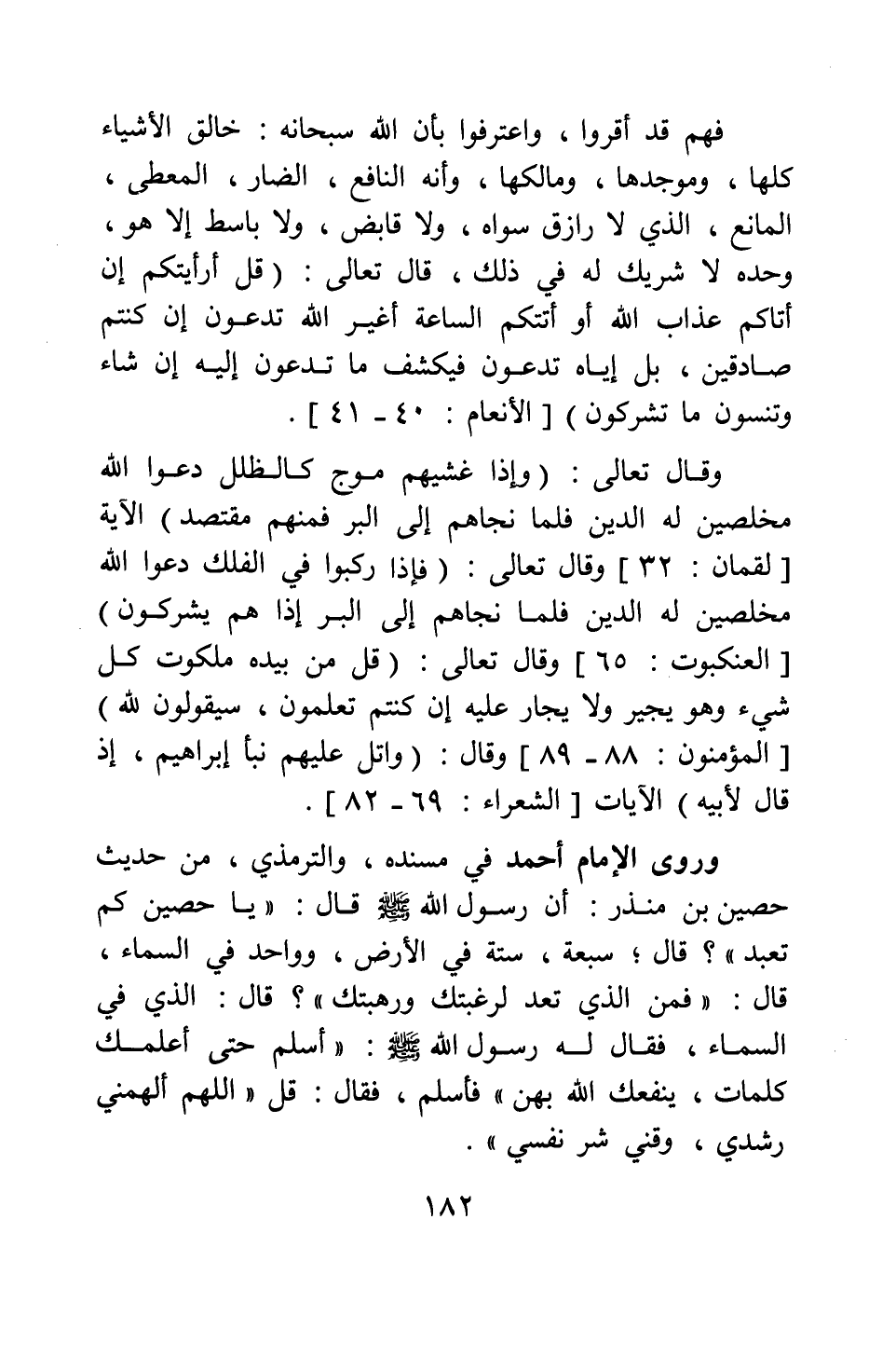 وروى الإمام أحمد في مسنده، والترمذي، من حديث حصين بن منذر: أن رسول الله (قال: " يا حصين كم تعبد؟ قال; سبعة، ستة في الأرض، وواحد في السماء، قال: فمن الذي تعد لرغبتك ورهبتك؟ قال: الذي في السماء، فقال له رسول الله: أسلم حتى أعلمك كلمات، ينفعك الله بهن فأسلم، فقال: قل اللهم ألهمني رشدي، وقني شر نفسي ".
