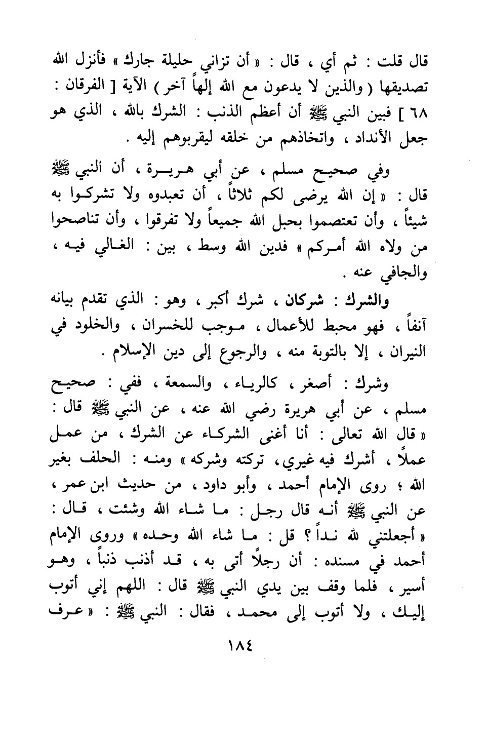 وشرك أصغر: كالرياء، والسمعة، ففي صحيح مسلم، عن أبي هريرة (عن النبي (قال: "قال الله تعالى: أنا أغنى الشركاء عن الشرك، من عمل عملا أشرك فيه غيري، تركته وشركه " 3. ومنه: الحلف بغير الله، روى الإمام أحمد، وأبو داود من حديث ابن عمر: " عن النبي أنه قال رجل: ما شاء الله وشئت، قال: أجعلتني لله ندا; قل: ما شاء الله وحده " 4، وروى الإمام أحمد في مسنده: " أن رجلا أتي به قد أذنب ذنبا، وهو أسير، فلما وقف بين يدي النبي (قال: اللهم إني أتوب إليك، ولا أتوب إلى محمد، فقال: النبي عرف